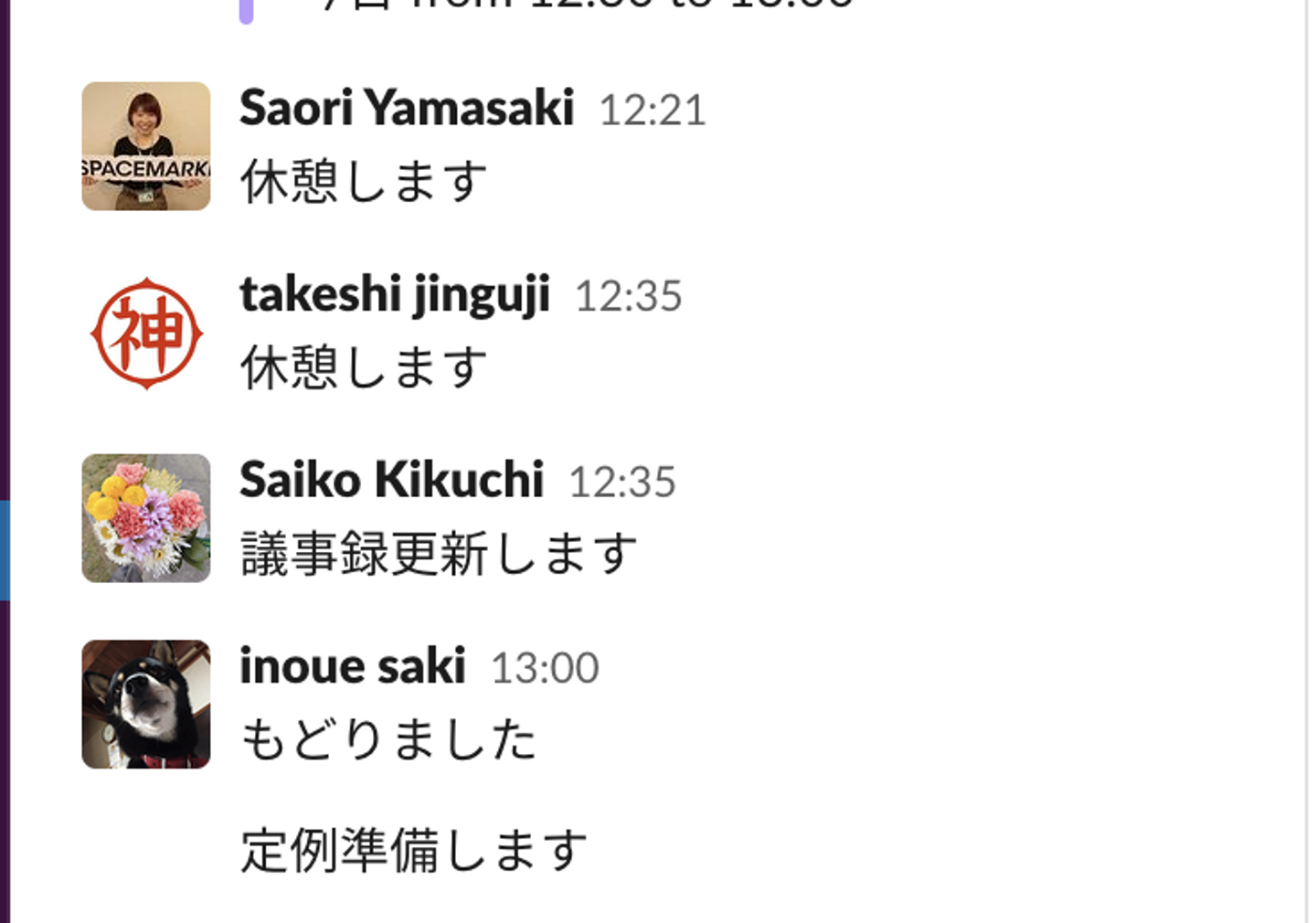こんな感じで、今から休憩するよ、議事録の更新をするよ、MTGに参加するよ、など自分の行動をSlackで報告することで、各メンバーの状況を理解した上で、業務のアサインをすることができます。