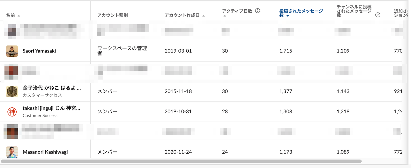 ちなみに、余談ですがこんな感じでSlackでのコミュニケーション量が多いため、チャンネル投稿数上位は、サポートチームのメンバーが多いのも特徴です。