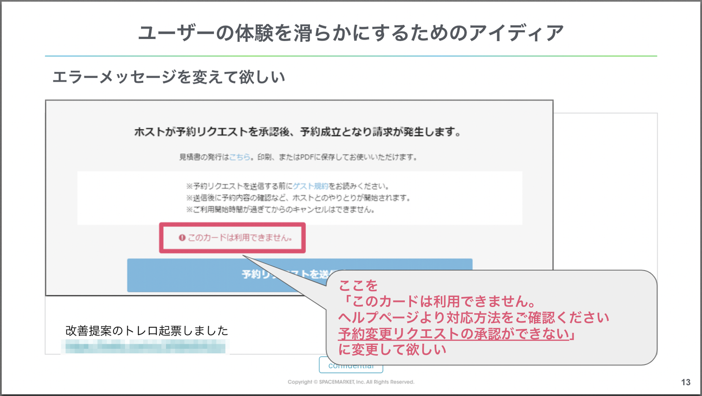分析を進める中で、カード決済でエラーが発生した時に表示される文言が若干分かりづらいことが気になりました。(効果音:プロフェッショナル 仕事の流儀の「ポーン」)