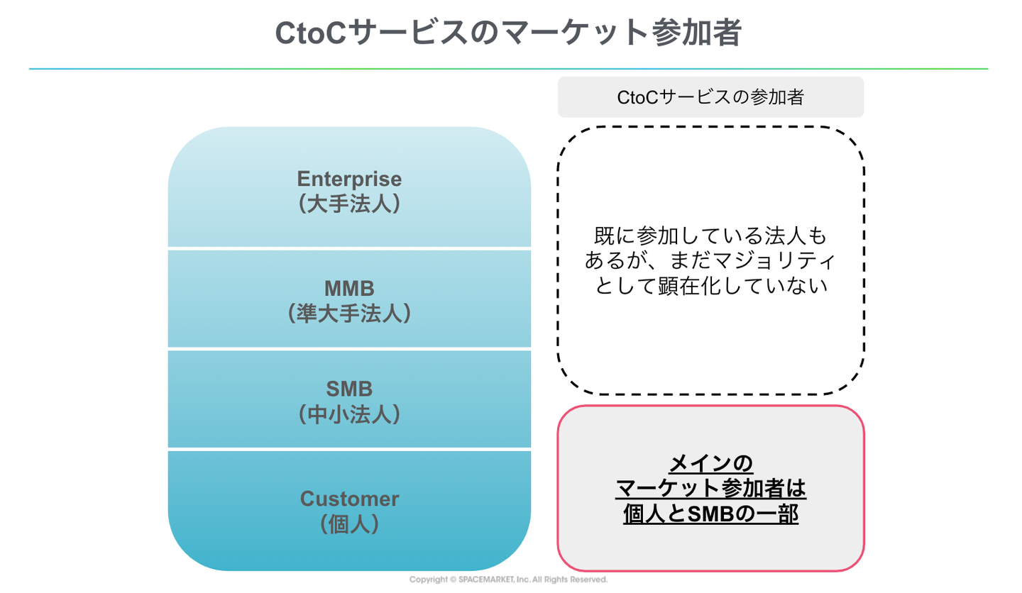 1でご紹介した通り、CtoCサービスのマーケット参加者は、「個人とSMB(中小法人)の一部」がメインです。
