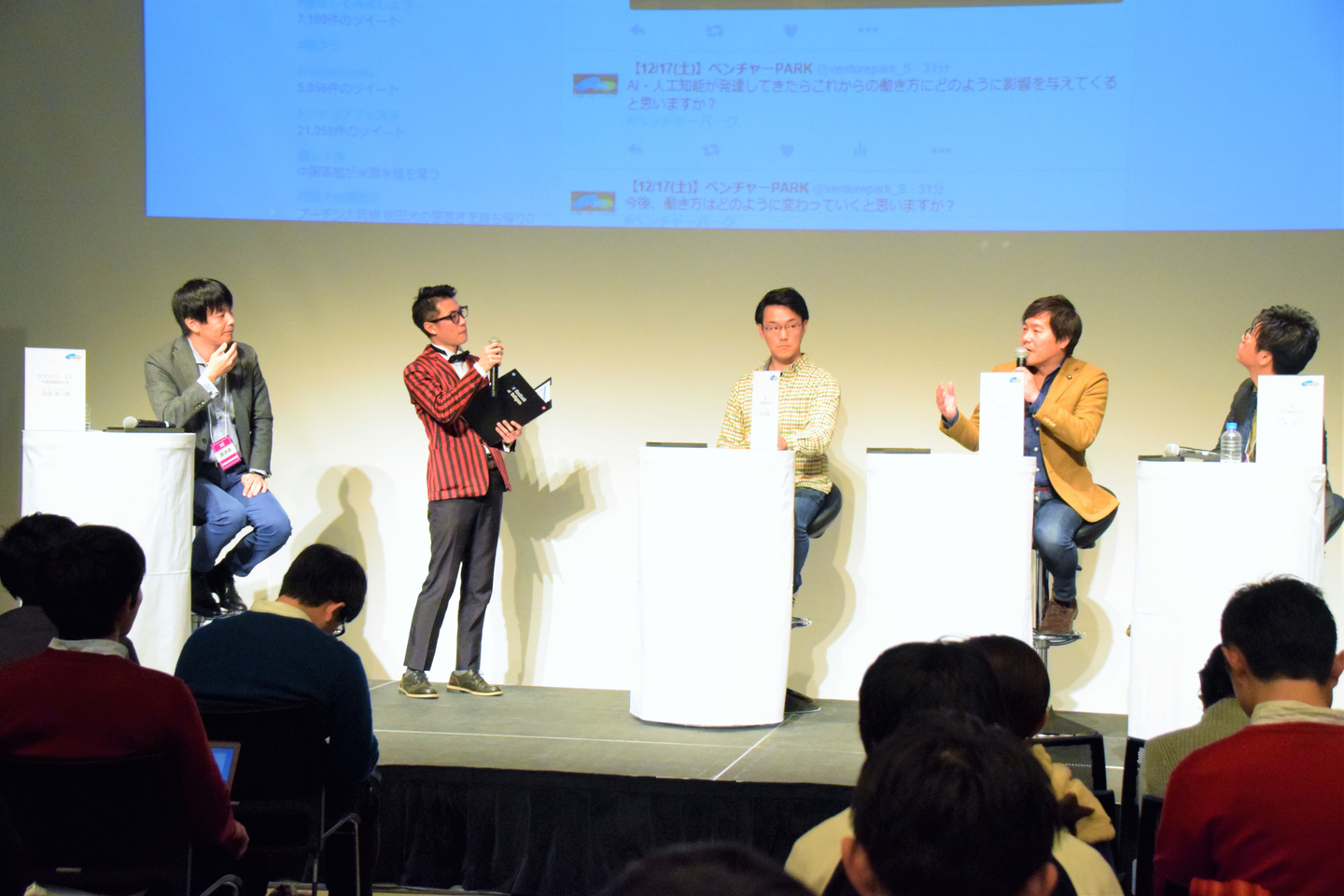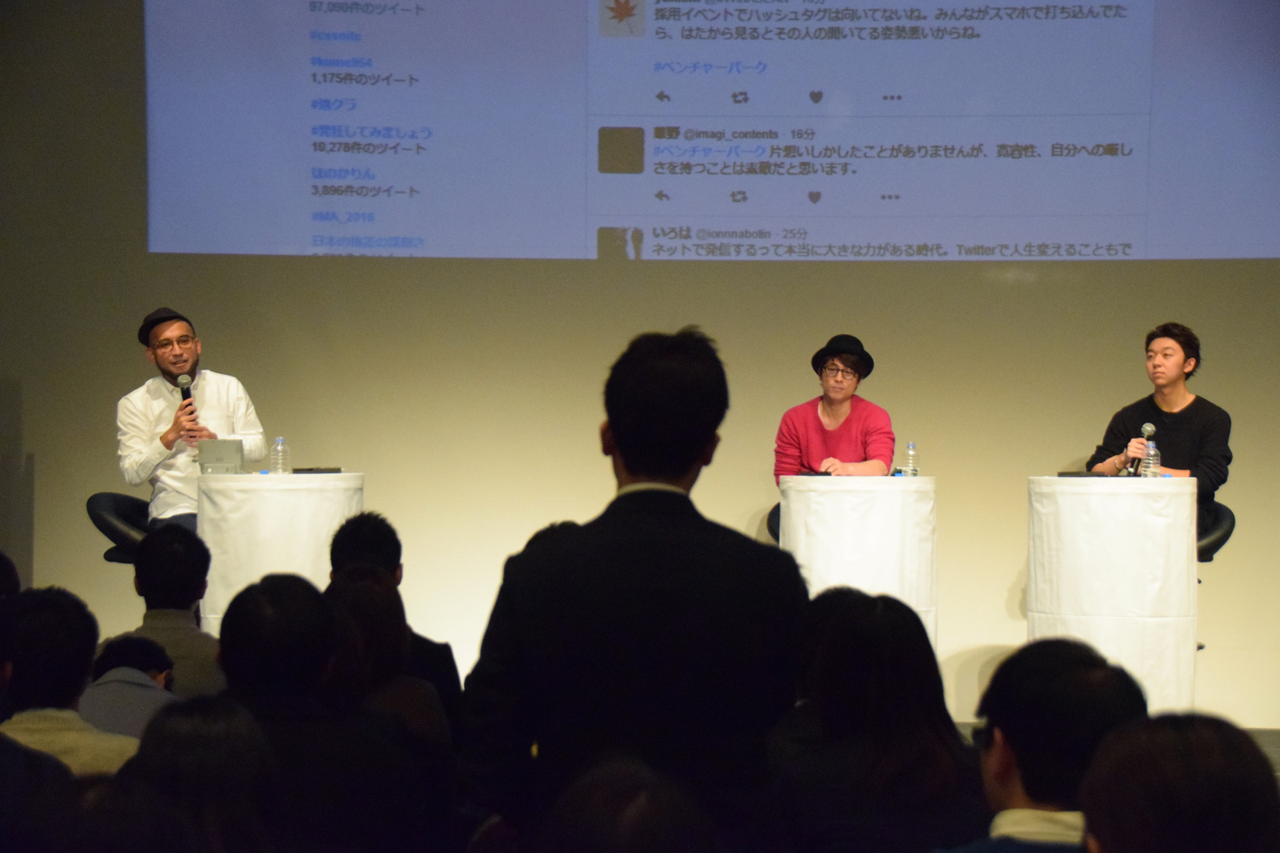 (下記写真:VENTURE SESSION1学生からTwitter投稿された質問を回答中)