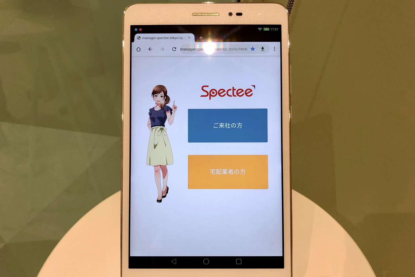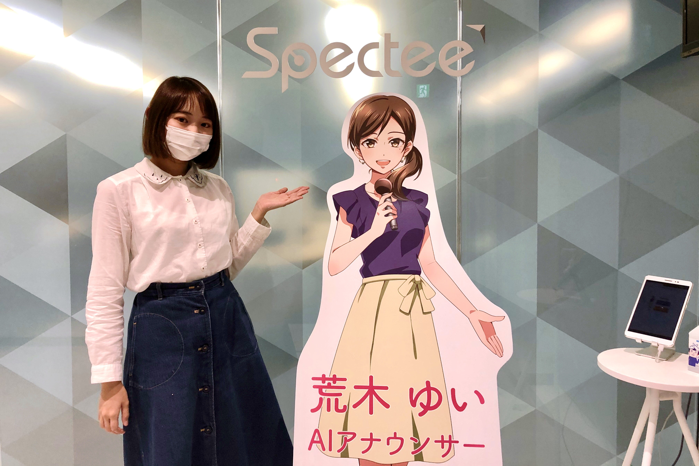 受付ではスペクティの看板娘である「荒木ゆい」のパネルがお出迎えしてくれます。「荒木ゆい」は、スペクティが開発したAIアナウンサーです。