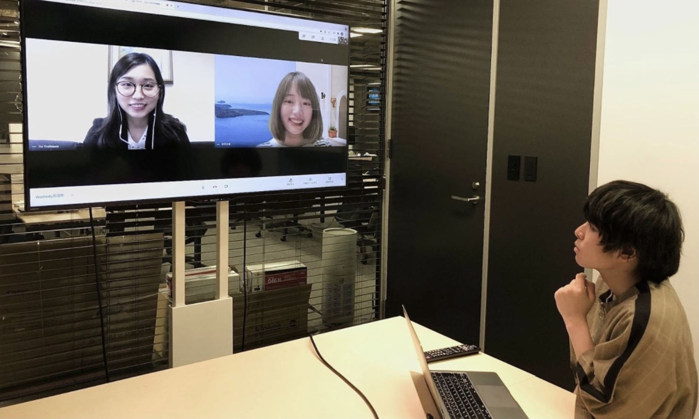 在宅メンバーとの打ち合わせ時は、大きなモニターも活用します。表情も見えて本当に会って話している様な感覚がします!(林)