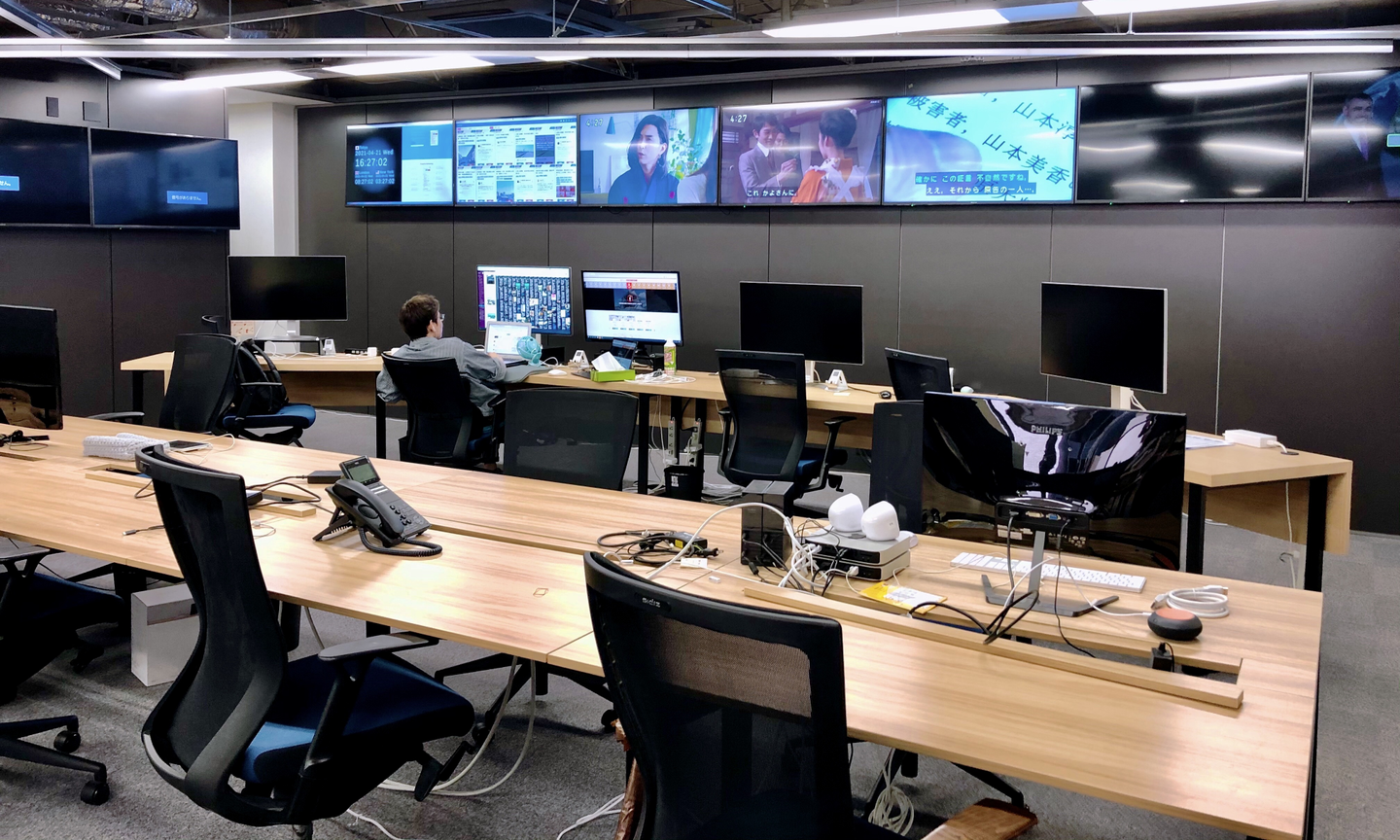 モニターがずらりと並び、各局のテレビが流れている様子は最新情報を扱う会社だなという感じがします。内装がかっこよくて気分も上がります。(安斎)