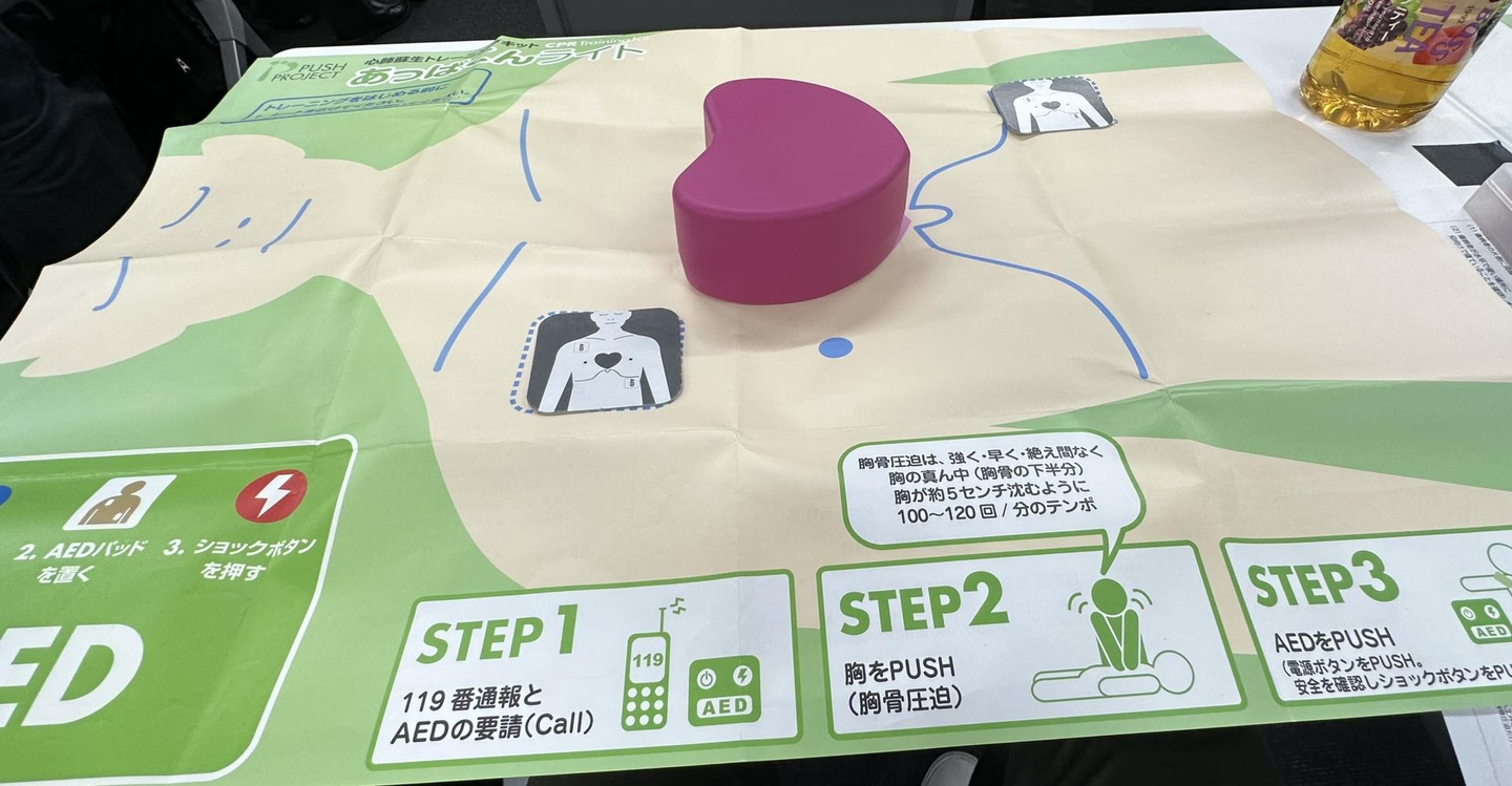 私が行った会場ではこのようなキットが一人ひとり配られ、何度も反復して心臓マッサージや声掛けの練習を行いました。この講習を受けると、資格取得に必要な「救急救命講習」の修了証がもらえます。