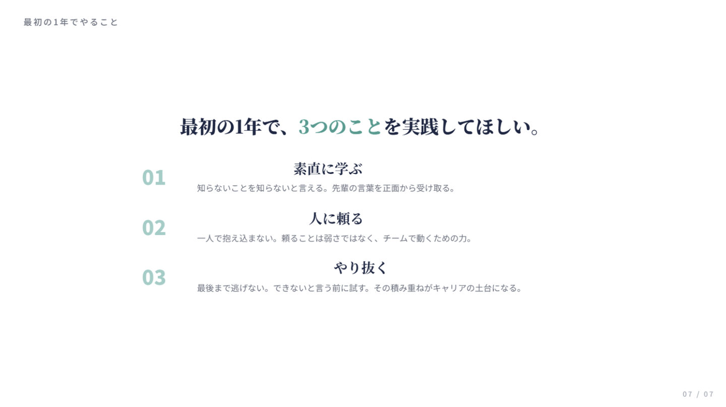 前向きな言葉が多く、これから苦しい場面で、入社式での気持ちを思い出してほしいです。