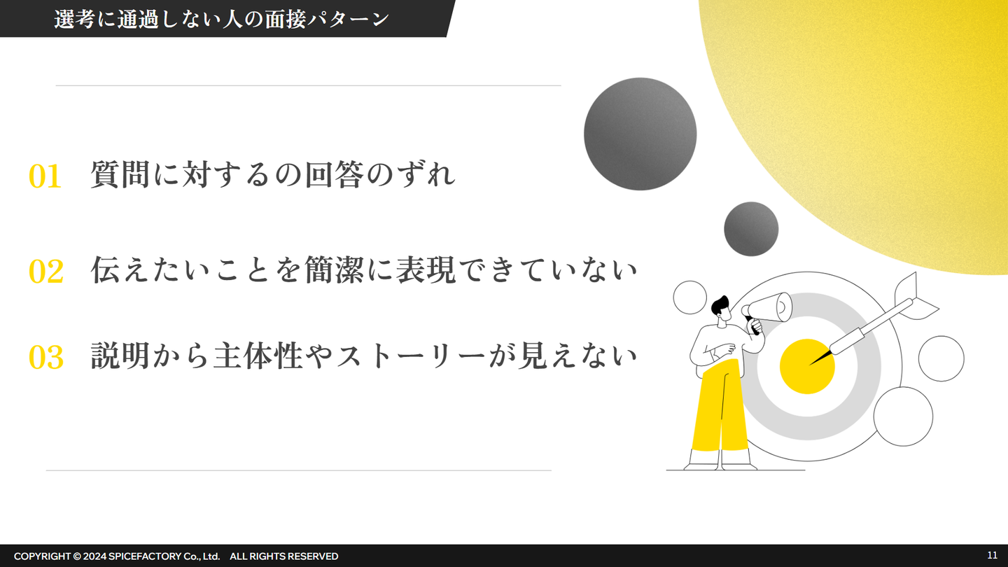 まず今回のセミナーについて、採用担当者が現場目線で選考に関する情報をお伝えしています。ただし、これから解説するポイントはあくまで一例であり、すべてを完璧にしなければ選考に通過しない、ということではありません。また、こちらに書かれているポイントを全てこなしたとしても必ずしも選考通過をお約束するものでもありません。