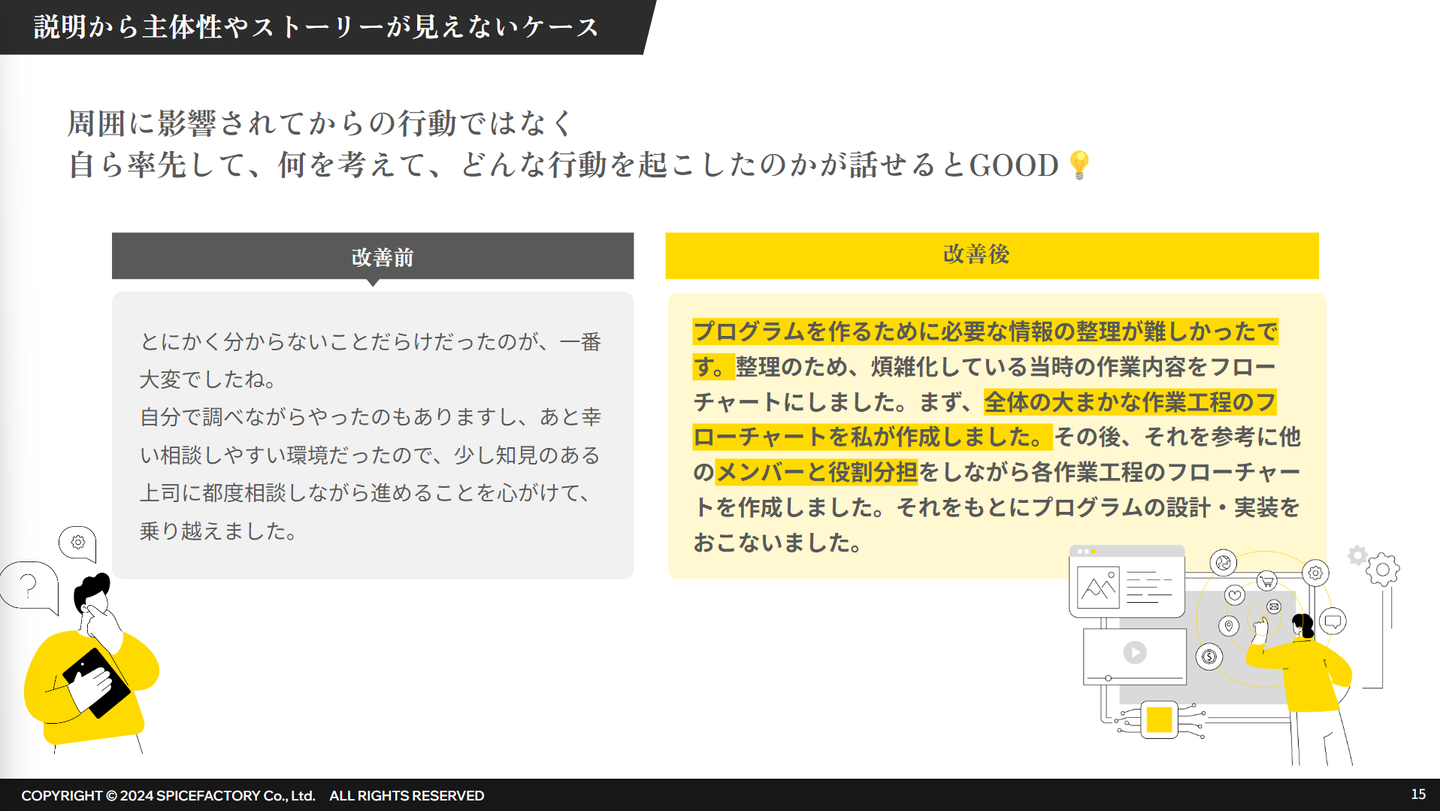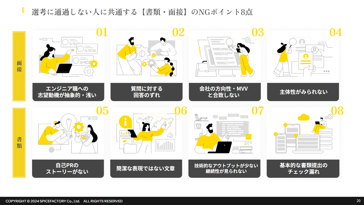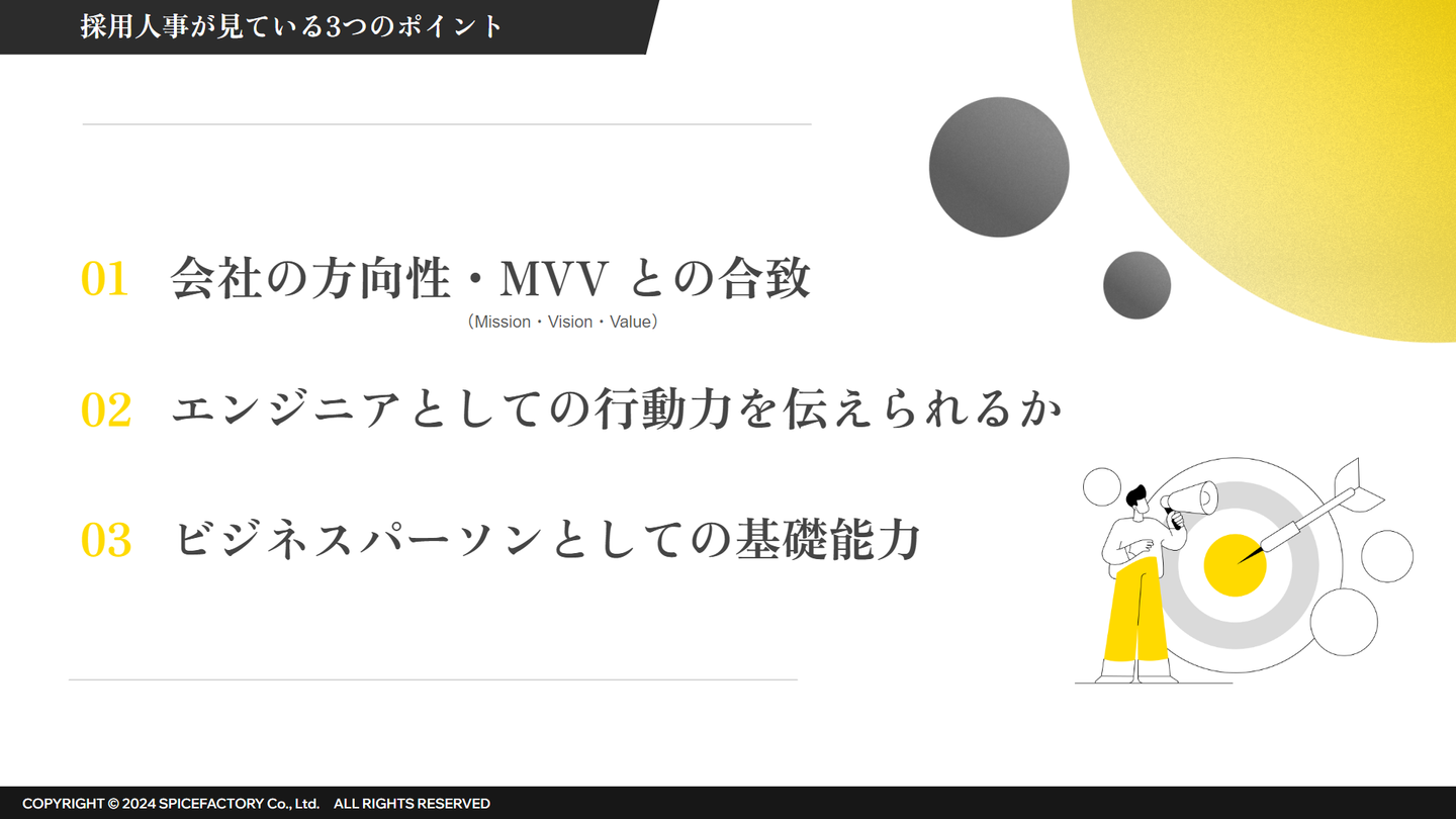 スパイスファクトリーでの採用でもこういった基準は大事にしていますが、これは当社のみならずどこの会社でも採用選考や実業務で見られるポイントです。このセミナーに参加した方、このレポートを読んだ方にとって何か気付きになり、今後の転職活動やその後の業務がより充実したものになることを私たちは願っています。