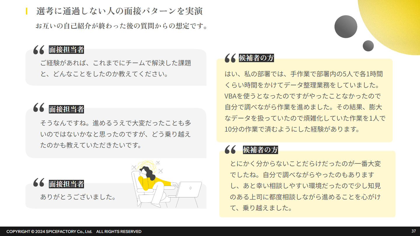 まずは数多くの面接を見てきたお二人から、選考に通過しない人の面接パターンを事例として面接を実演いただきました。