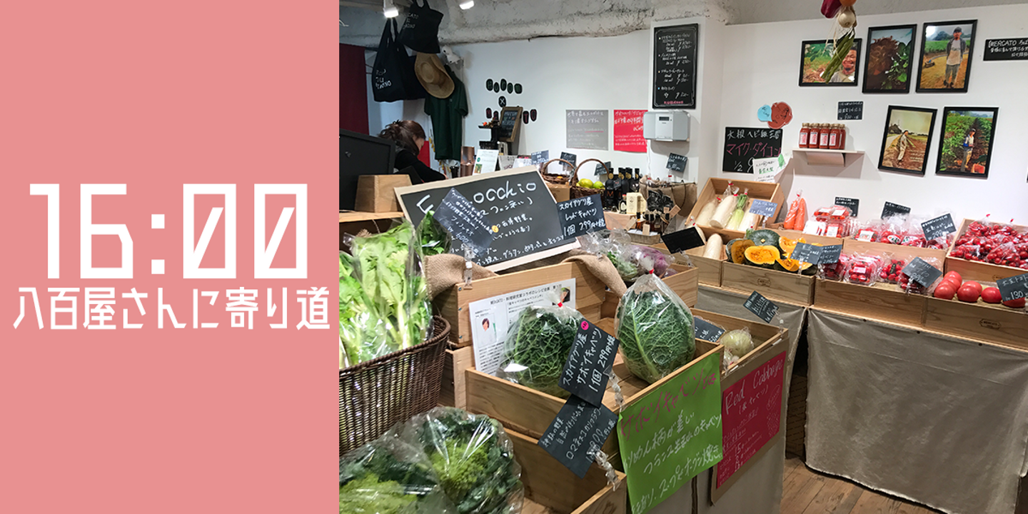 ここで1週間分の野菜をまとめて購入します。静岡県出身で、実家が果樹園の彼女。実は、実家の果物をこちらのお店に卸しているそうです。有機野菜や無農薬にこだわった八百屋さんで、通ううちに、そんな繋がりができていったのだとか。さりげない営業力、さすがです。