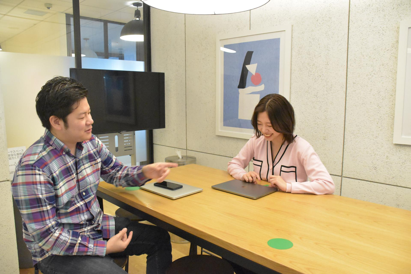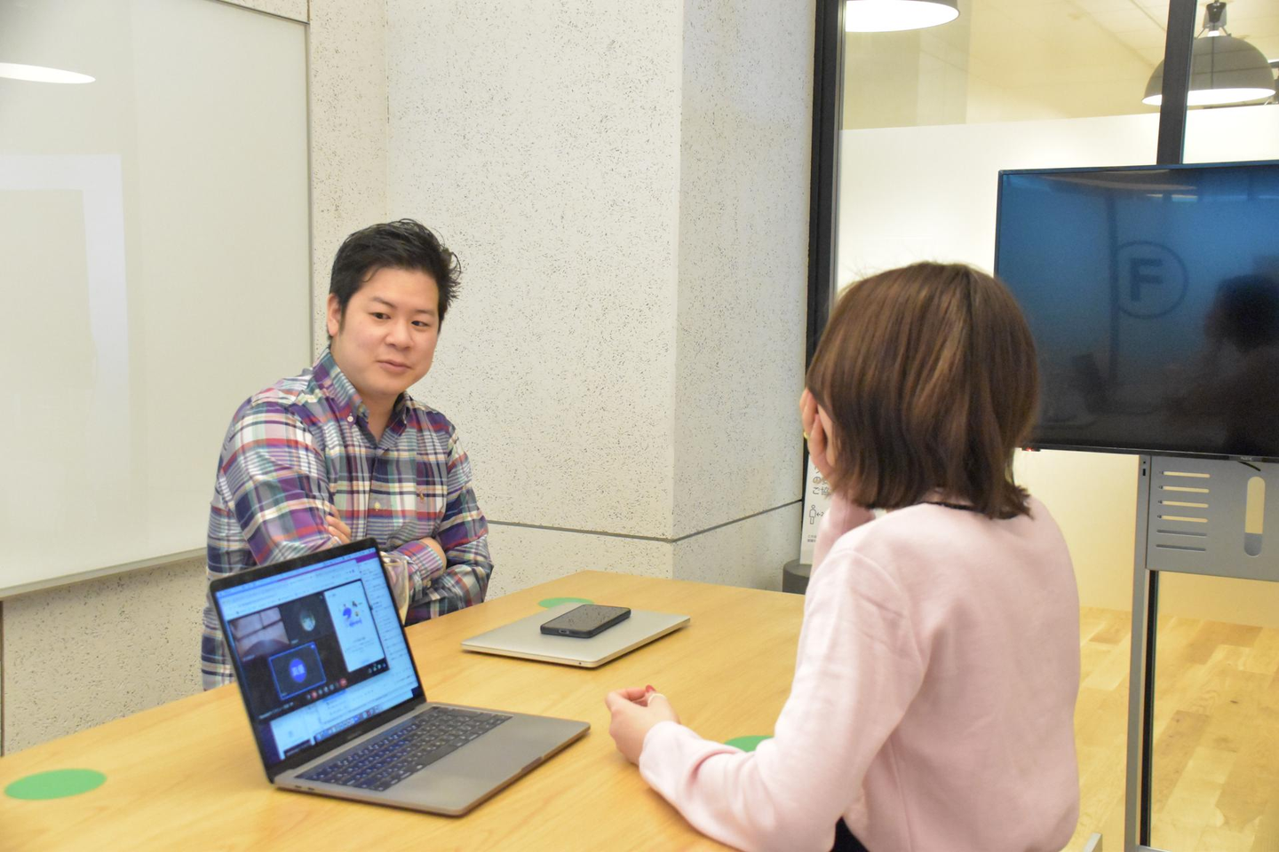 河原林:僕が折笠の育成担当の先輩だったこともあり、入社から半年間は毎日1on1(1対1で日々の出来事などを話せる機会)を設けていました。今でも週2回はしているのですが、困っていることを聞いたり、質問に答えたりしています。