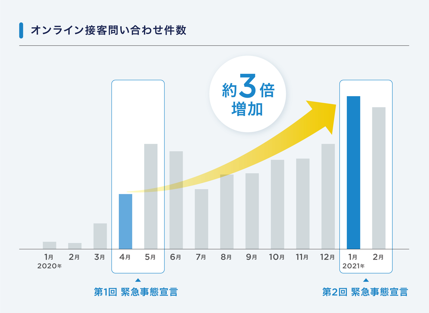 ■1月の緊急事態宣言以降、オンライン接客への問い合わせが急増、2020年4月比で3倍に