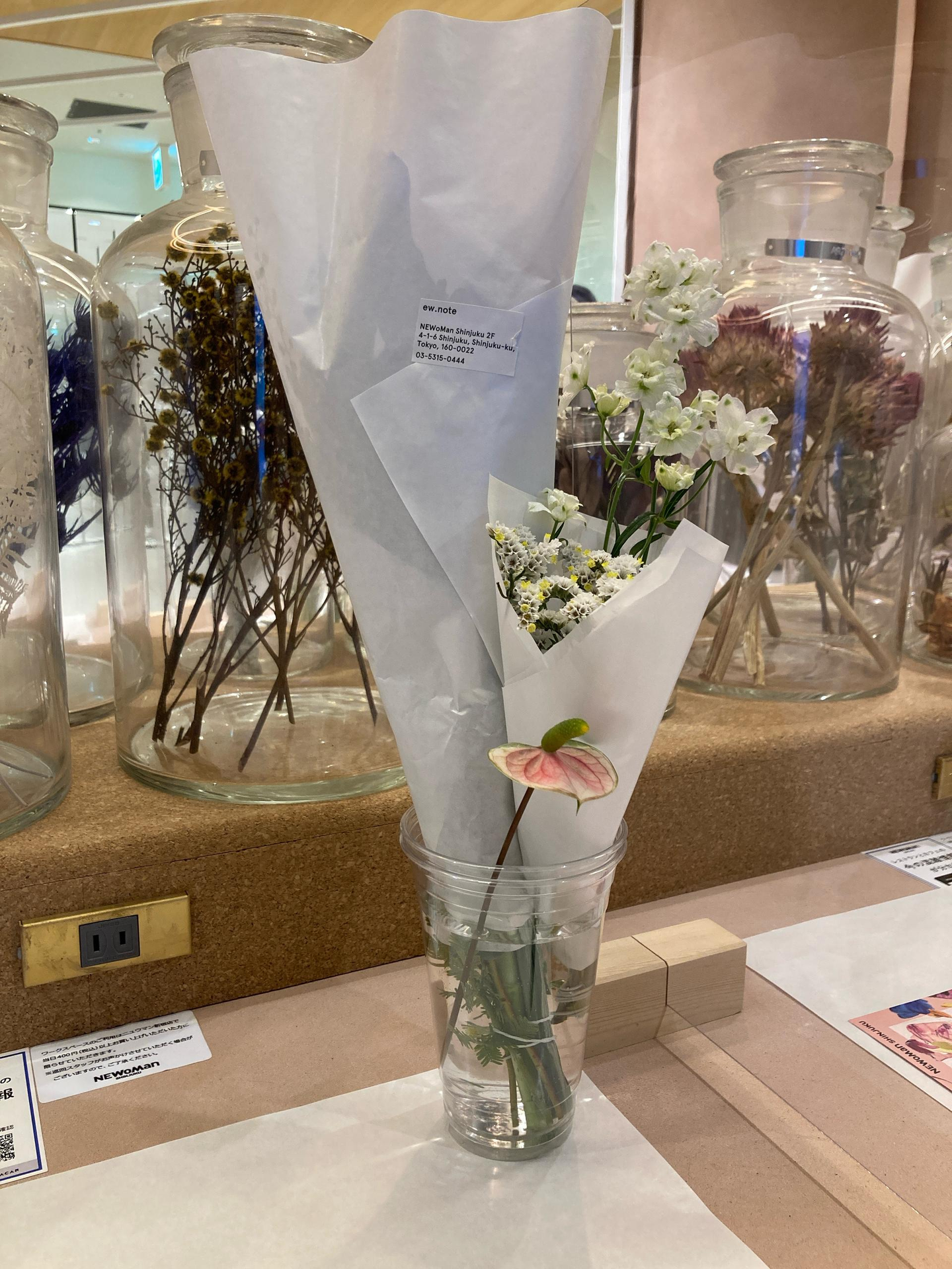 大学の課題で使う材料を購入するため、よくハンズ新宿店に通っていたのですが、その道中にあるNEWoMan新宿のフラワーショップ「ew.note」がずっと気になっていました。春休みに入ったタイミングでちょうどワークショップの告知を見つけたので、すぐに参加を決意。当日は雪が降っていたので「電車が遅延して遅刻したら大変!」と早めに出発したら、30分ほど早く到着してしまいました。