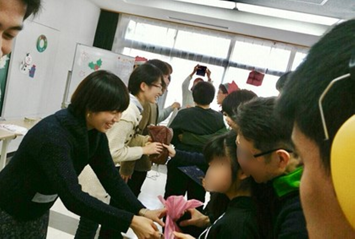 この写真は大学のボランティアサークルの写真になるんだけど、ちょうど1年前のクリスマス会の時の写真で!障がいのある子とそのご家族と一緒にクリスマス会をやる活動で、みんなでメッセージカードを書いて渡したりしたの!