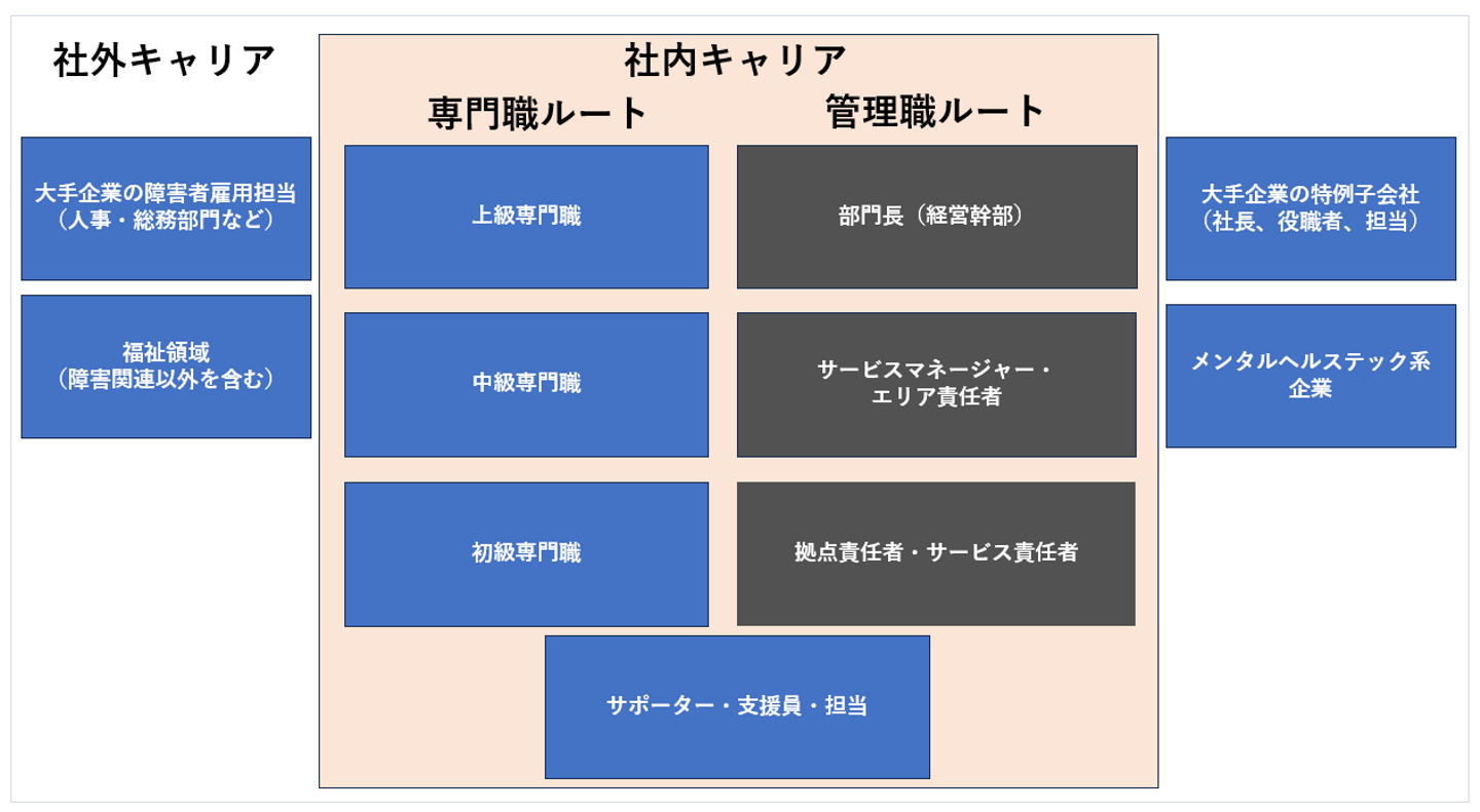 最後にキャリアについて。社内では、専門職ルートと管理職ルートが用意されています。支援職・心理職を中心に、専門性を極めていくこともできますし管理職として会社のビジネスをリードしていくことも選択できます。
