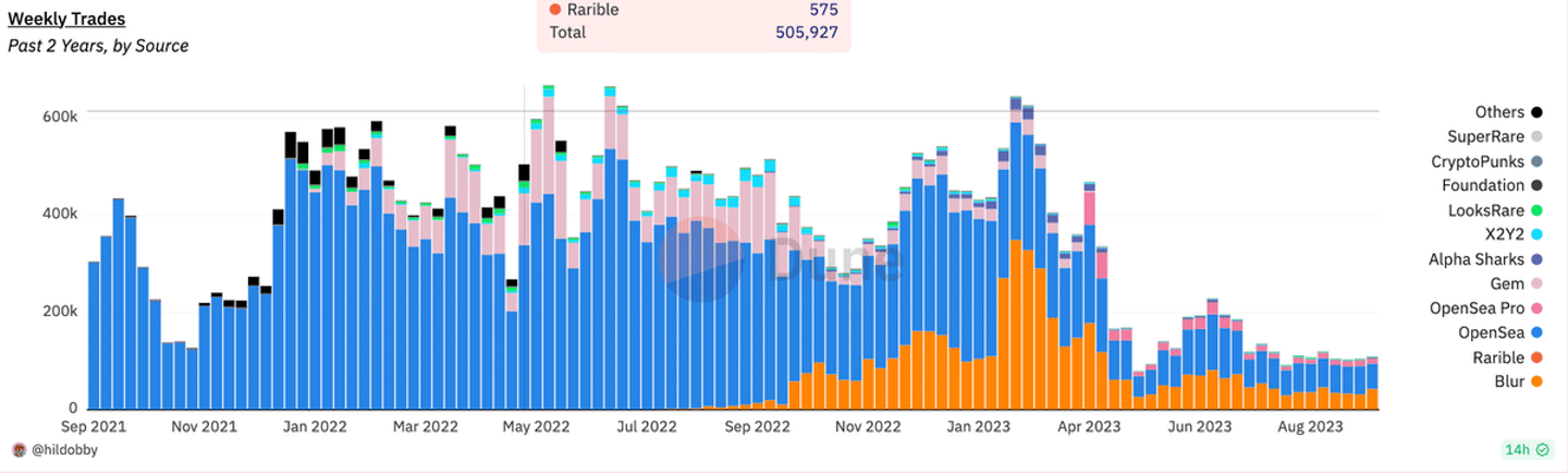 Ethereum上のNFT取引量推移(取引数ベース)出典: Dune Analysis