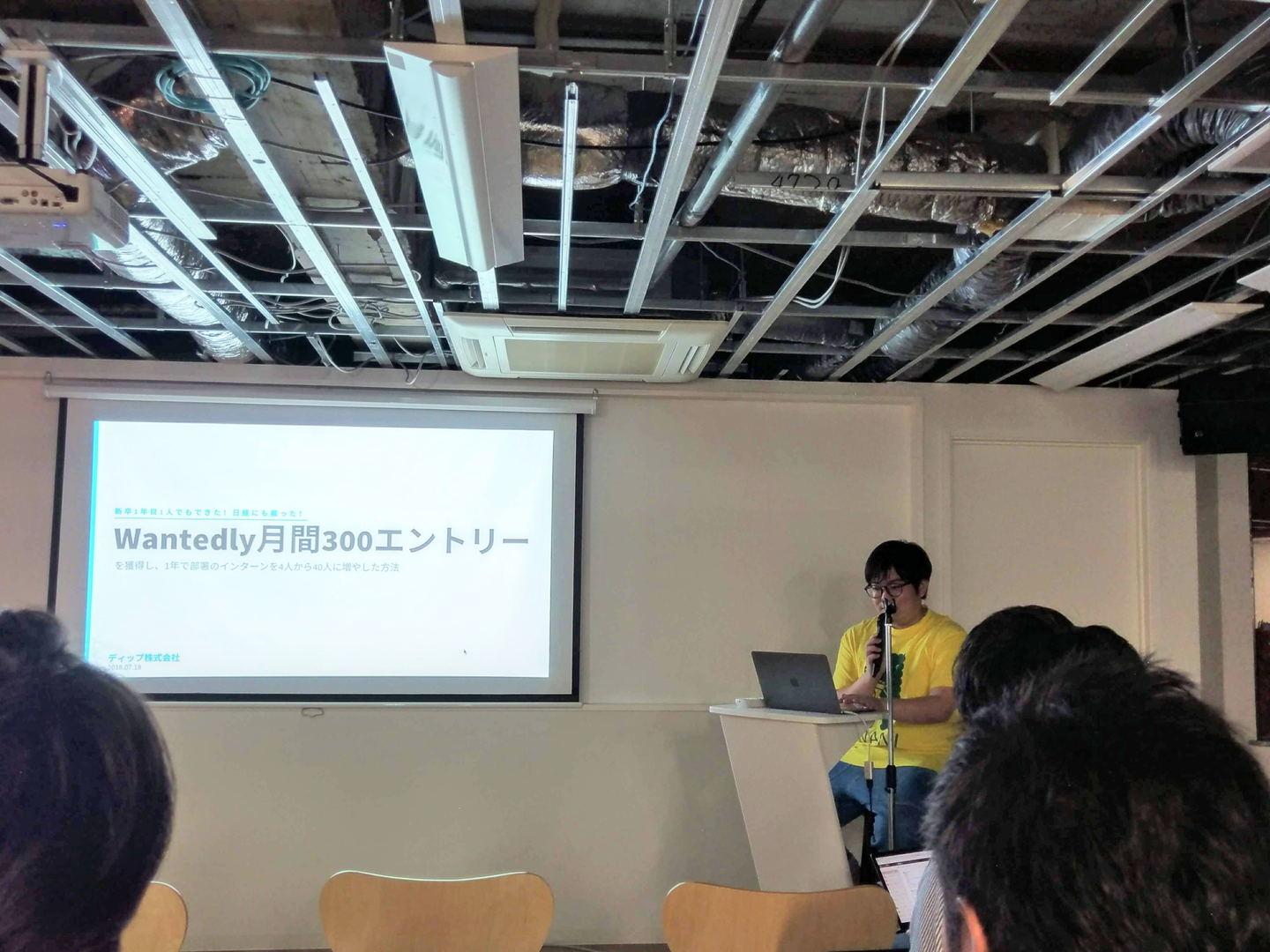 今回のお目当ては、「ディップ株式会社 小林 宥太さん Wantedly月間300エントリーを獲得し、1年で部署のインターンを4人から40人に増やした話」です。