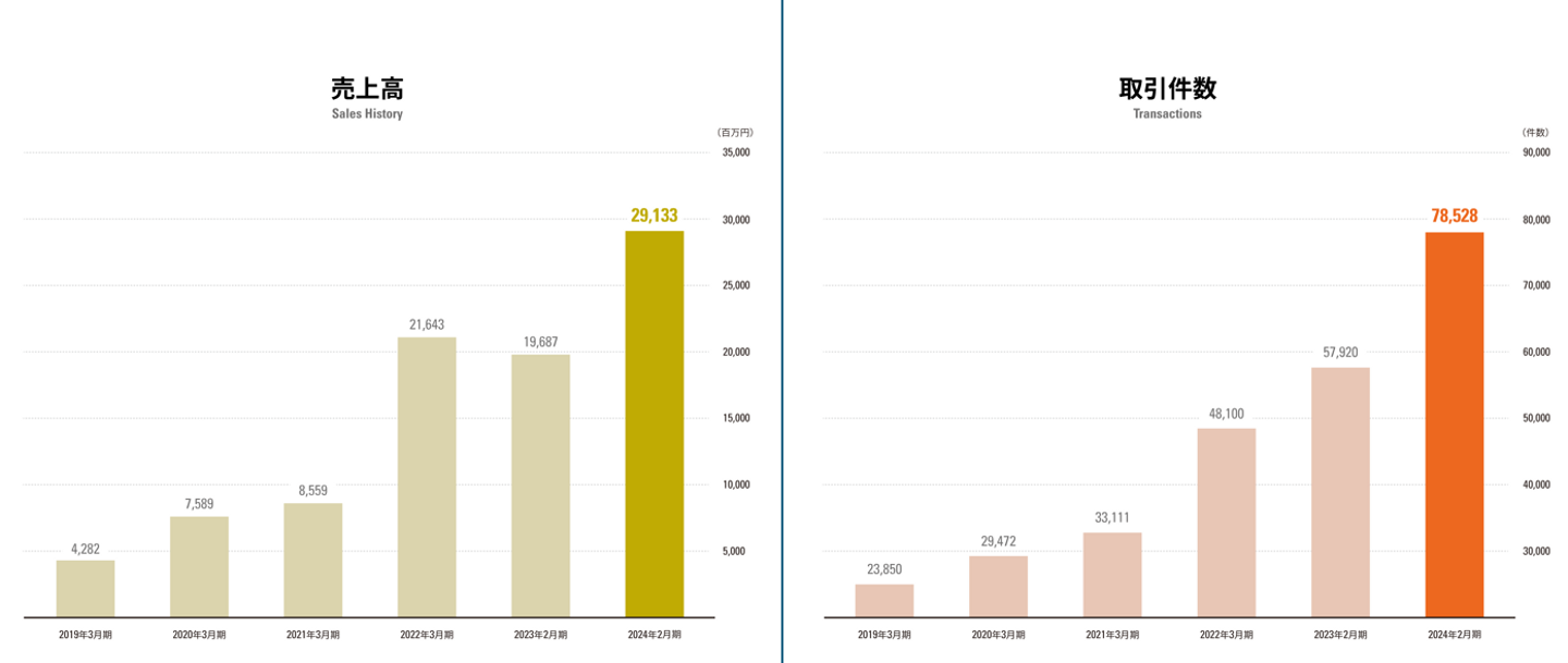 当社はリユース業界の発展と共に、着々とリユースサービスとお客様との接点を作り、売り上げは291億円を超え、お買取りの取引き[f8] 件数は約27万1千件に及びます。(算出期間:2019年~2023年)