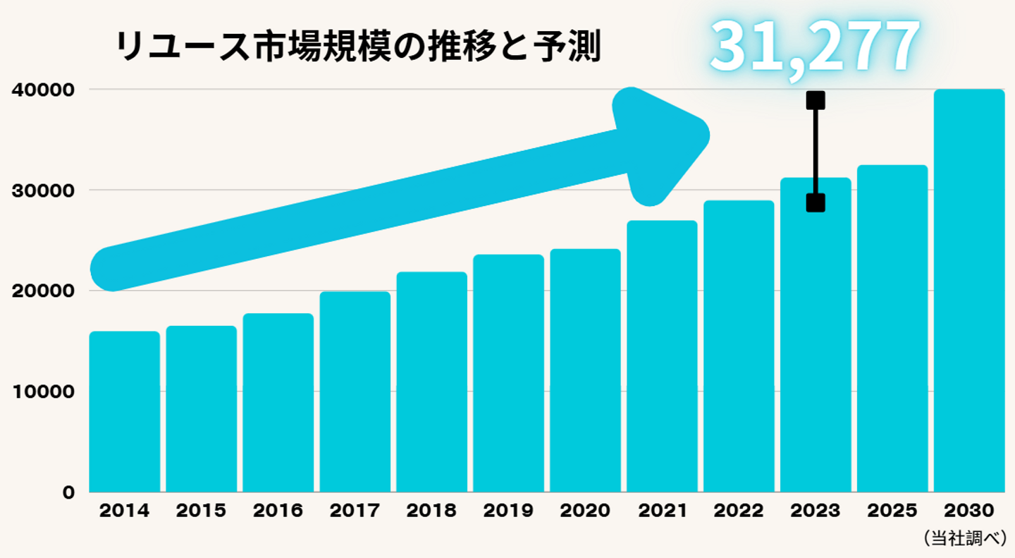 リユース業界は今後も市場規模の拡大が見込まれ、[f1] 2030年には市場規模が4兆円にまで成長することが予想されています。衣食住に関わる製品などの物価上昇が続くなか、[f2] 消費者の生活防衛意識の高まりから、新品よりも割安なリユース品が注目を集め、加えて、訪日観光客によるインバウンド需要が回復していることも追い風になっています。リユース人口は、2020年で3400万人。2030年には3850万人と450万人増加。市場の認知拡大により、リユース品は消費者にとって購買時の選択肢の1つになりつつあるという計測も出ています。[f3] (引用:①リユース経済新聞|リユース業界の市場規模推計2024 ②リサイクル通信|リユース市場データブック2023)