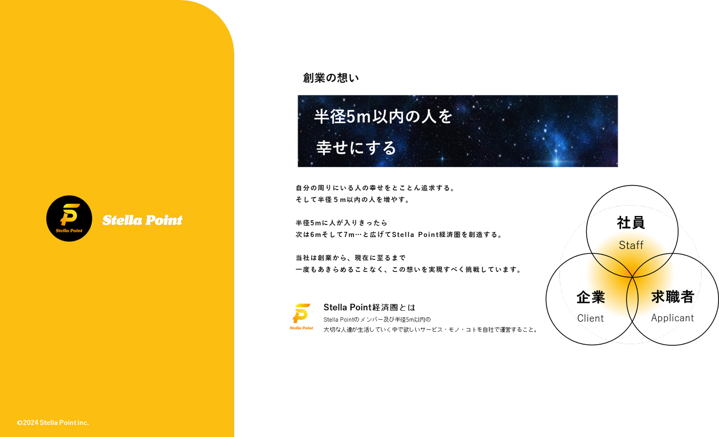 当社Stella Pointは、人材紹介・研修・採用コンサルティング・採用イベントなどの新卒採用支援事業を展開しています。『半径5m以内の人を幸せにする』を理念に、一人ひとりが「ココロ弾む」選択肢を広げる社会を目指しています。新卒学生向けのエージェントサービス「X-career」をはじめ、学生主体の研修プログラムである「X-base」を提供し、企業や団体の経営戦略・人材戦略の実現に貢献しています。