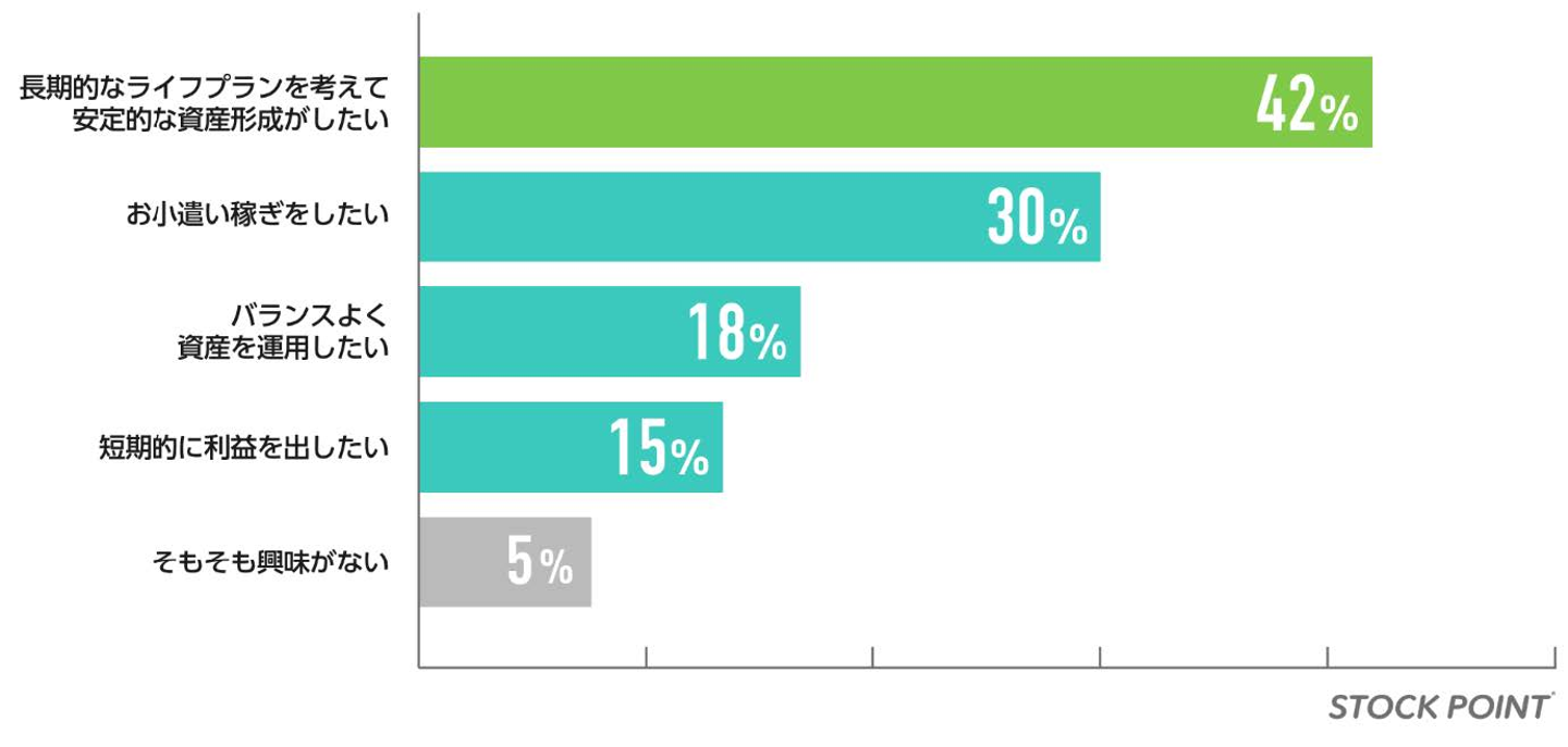 回答者の半数近くが、「長期的なライフプランを考えて、安定的な資産形成がしたい」と回答しました。短期的な利益を出したいという方は15%にとどまり、ポイント運用を楽しむ方は長期安定志向であることがわかりました。STOCK POINTなら、現金を使わずに、ポイントを使い、じっくりと勉強しながら、資産形成を楽しめます!