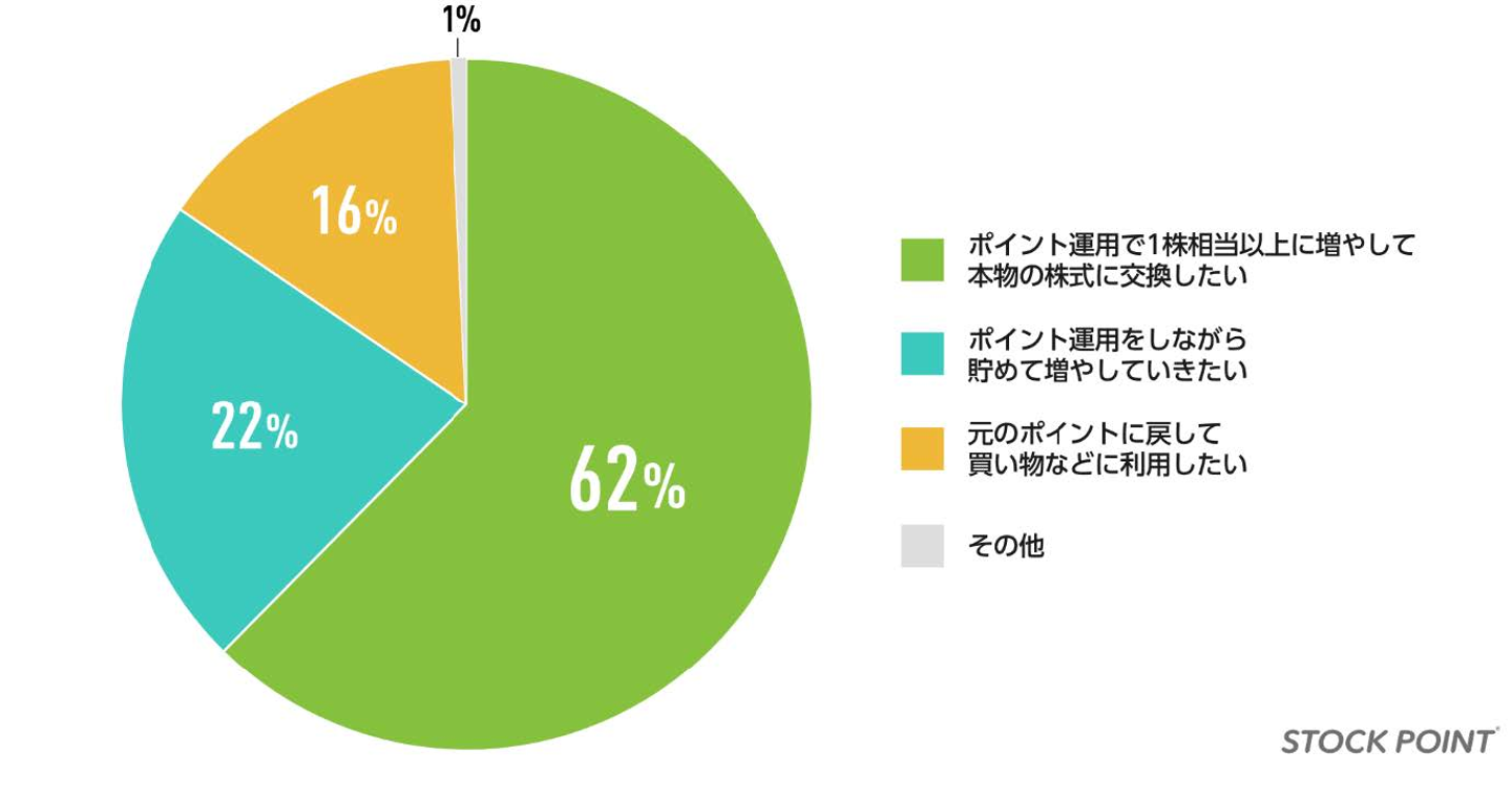 1位は「本物の株式に交換したい」で62%、2位「ポイント運用サービスの中で貯めて殖やしていきたい」という結果となりました。