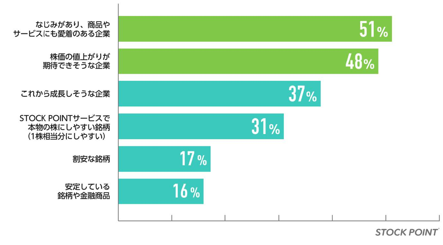 ポイント運用先銘柄の選び方は、「普段からよく知っていて愛着のある企業」が1位で51%という結果になりました。また「株価の値上がりが期待できそうな企業」も48%と多く、ポイント運用先企業の活動や将来性に対して高い関心を持っていることがわかりました。投資を始めるときにどの銘柄で運用しようか皆さん悩むかと思いますが、ぜひ「ここのお店の食事はおいしかったな~」とか「ここのスタッフさんに親切にしてもらったなぁ~」など、ご自身の経験を元に選ぶ方も多いですよ!