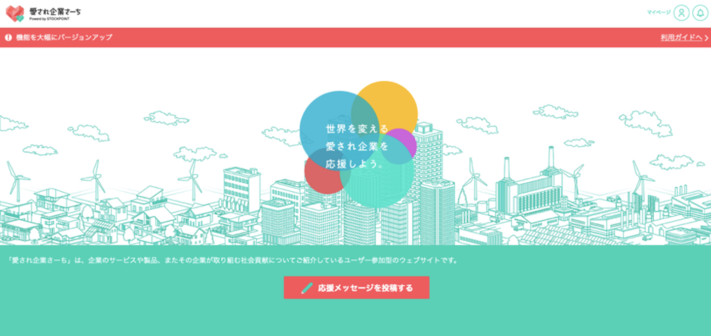 「愛され企業さーち」(通称:愛されっち)とは、企業のサービスや製品、社会貢献活動について紹介する、STOCKPOINTのオウンドメディアです。ユーザーが企業に対する応援メッセージを投稿したり、そのメッセージに対してリアクションできる、SNS要素の組み込まれたwebサイトになっています!