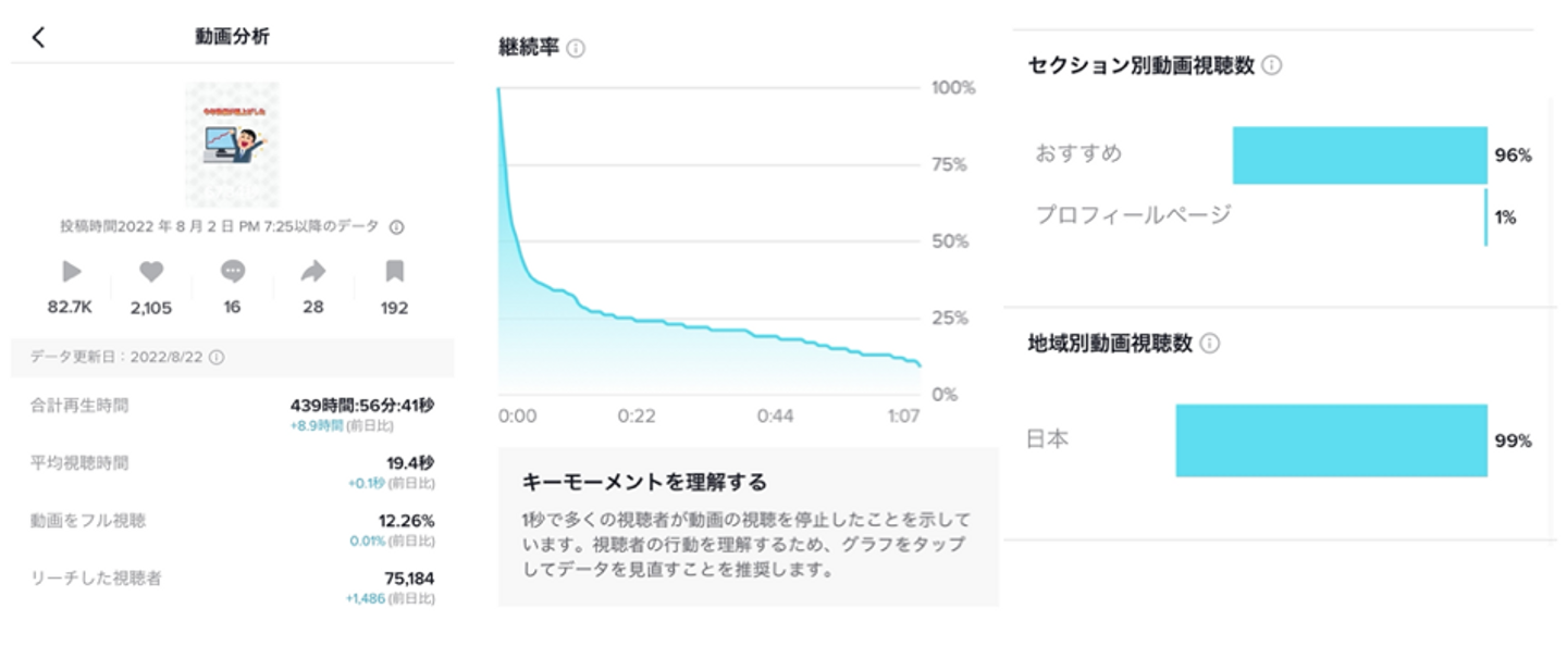 こちらのデータからは、再生回数、またその内のいいね数や保存回数などの反応も良く、全体としては成功であったことがわかります。一方で、動画が再生されてから5秒以内に離脱してしまった方が60%近くいらっしゃり、動画の入りに改善の余地があることがわかります!