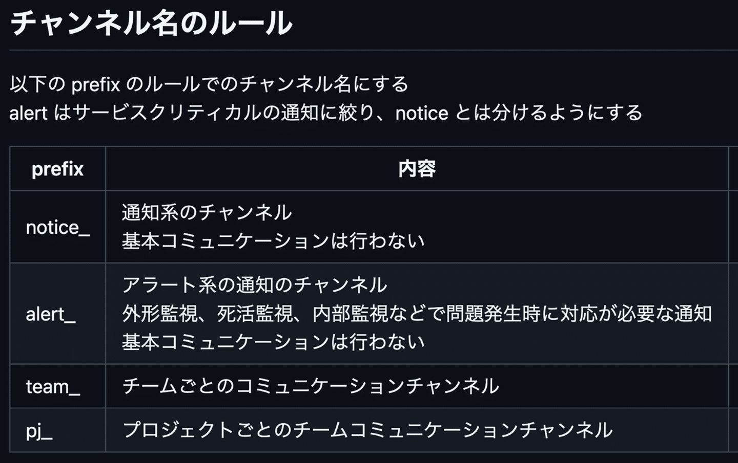 今までは開発メンバーも少なく問題なかったのですが、Slack チャンネル名が統一されておらず、どこで何を話してよいか?どのチャンネルを見るとよいのか?など新規メンバー視点で迷うことが増えました。もっとメンバーが増えたタイミングで確実にコミュニケーションロスが発生しそうだったため、プレフィックスの整理や既存のチャンネル名の更新、新規チャンネル作成を行いコミュニケーションインタフェース整理を行いました。