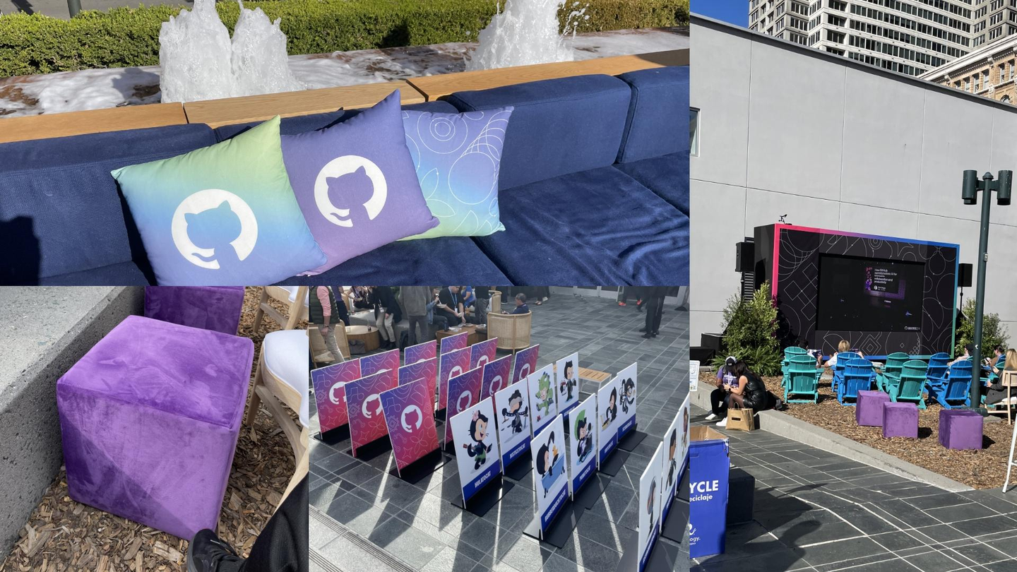 サンノゼ・サンフランシスコ・サンタクララは基本、天気が良く、快晴である事が 多く野外に何か置いてあることが多いような気がします。 日差しが強く何も、遮るものがなかったりするので、サングラスはほぼ必須です。 カンファレンス中の2日とも、快晴で、野外ステージが役立っていました。Octocat(Gitネコ)のパネルカード、 AKSかAzureで動いてるContainerの形をした、椅子、座ったらいい感じにfitするソファが地面にどさりと置かれていたり