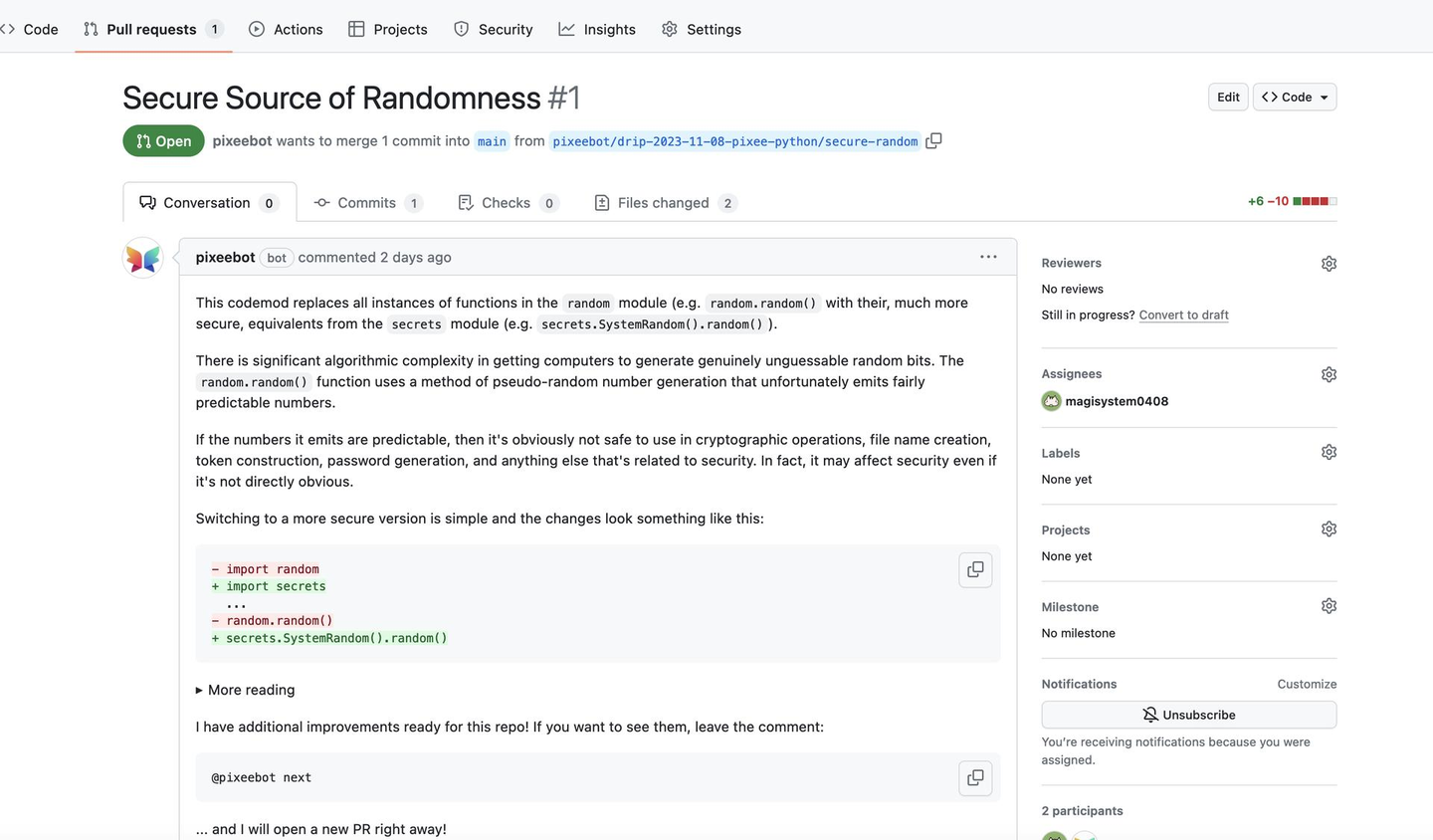 1日目に展示していた、企業でpixee.aiというサービスは、python,javaなどで書かれた、github repositoryとpixee.aiを連携させて pixeeが、コードの書き方でセキュリティに問題がないかをチェックしてPullRequestを作成してサジェストしてくれるというサービスを展示していました。 おそらく、上記画像のような自社LLMまたは、chatGPT+自社のプロンプトがサービス内で定期実行されてるのかと思います。