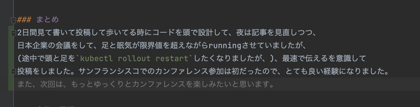2日間見て書いて投稿して歩いてる時にコードを頭で設計して、夜は記事を見直しつつ、 日本企業の会議をして、足と眠気が限界値を超えながらrunningさせていましたが、 (途中で頭と足をkubectl rollout restartしたくなりましたが、)、最速で伝えるを意識して 投稿をしました。サンフランシスコでのカンファレンス参加は初だったので、とても良い経験になりました。