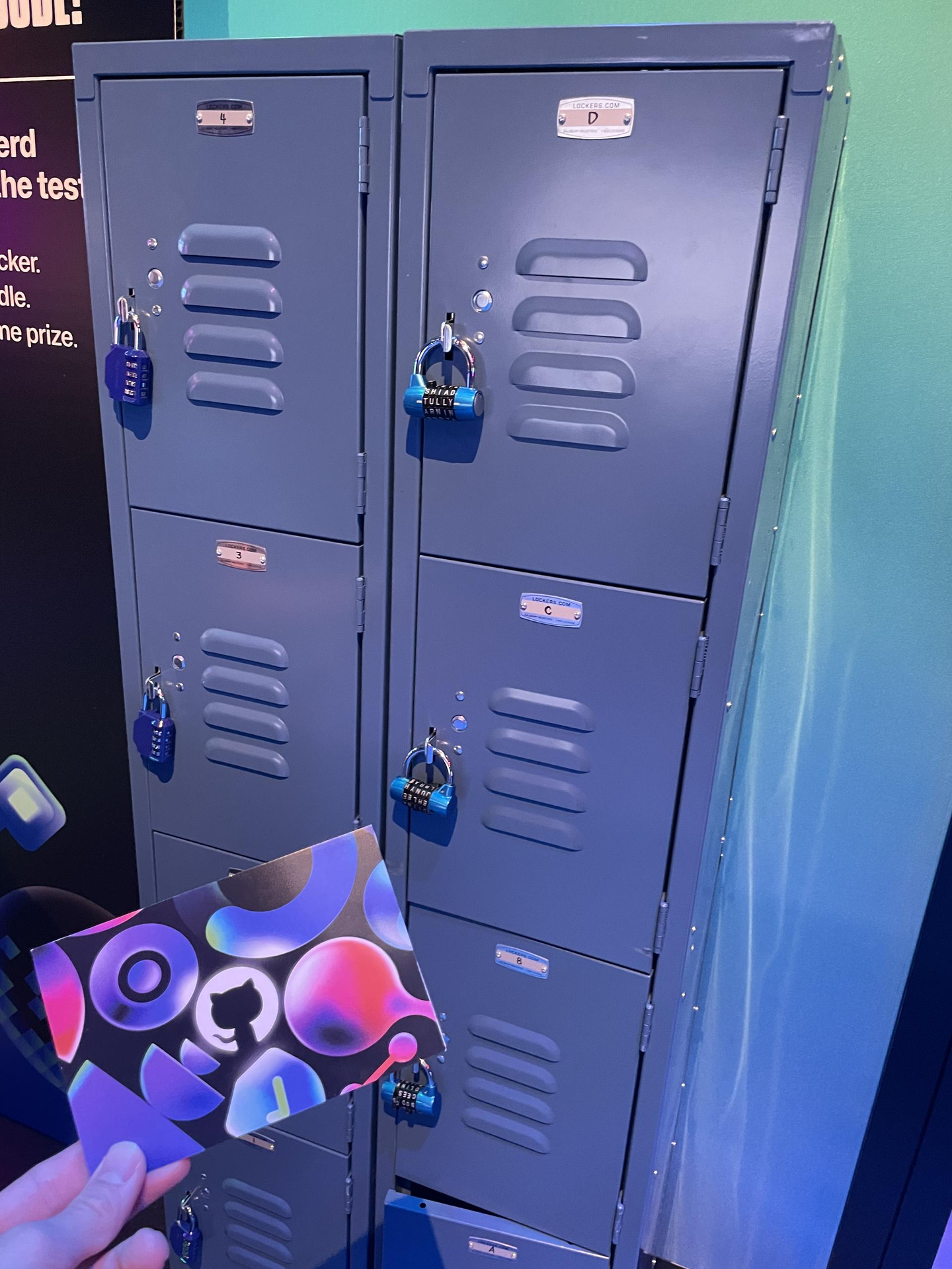 カードに、ハッキングするお題が書かれていて、その回答をロッカーの暗証番号に入れて鍵を開ける方式のアトラクション?がありました。 多分ハッキングに成功してロッカーを開けられると景品がもらえるのかなと思います。私も挑戦しましたが、開錠できませんでした。 確か、Realmのテストケースに関しての問題だった気がします。