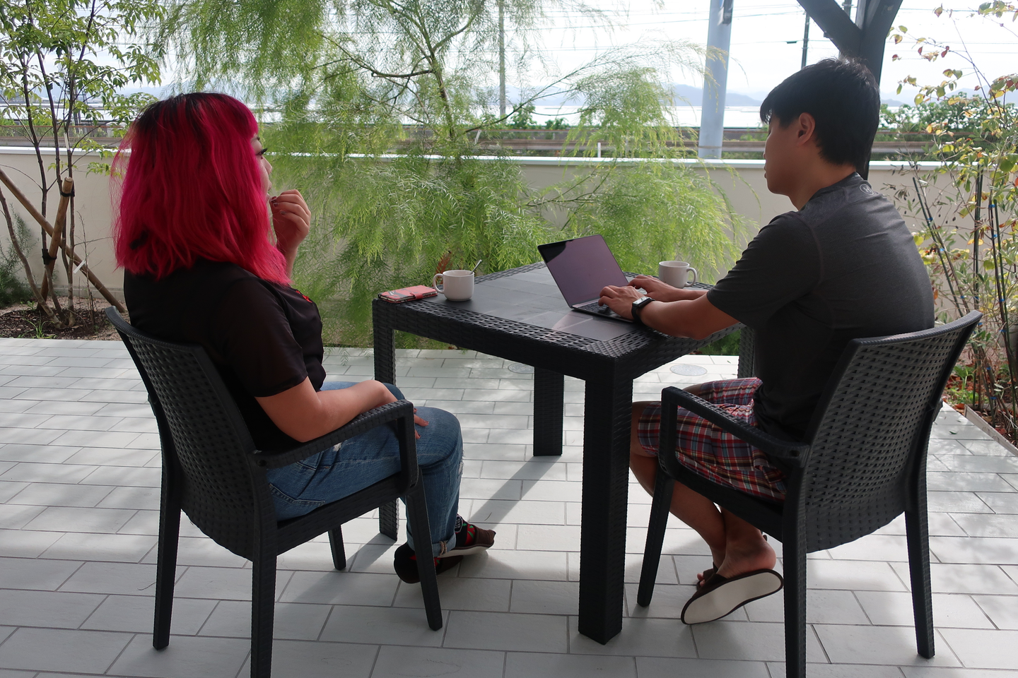 朝のテラスでコーヒーを飲みながら、メンバーと1on1をやってる図