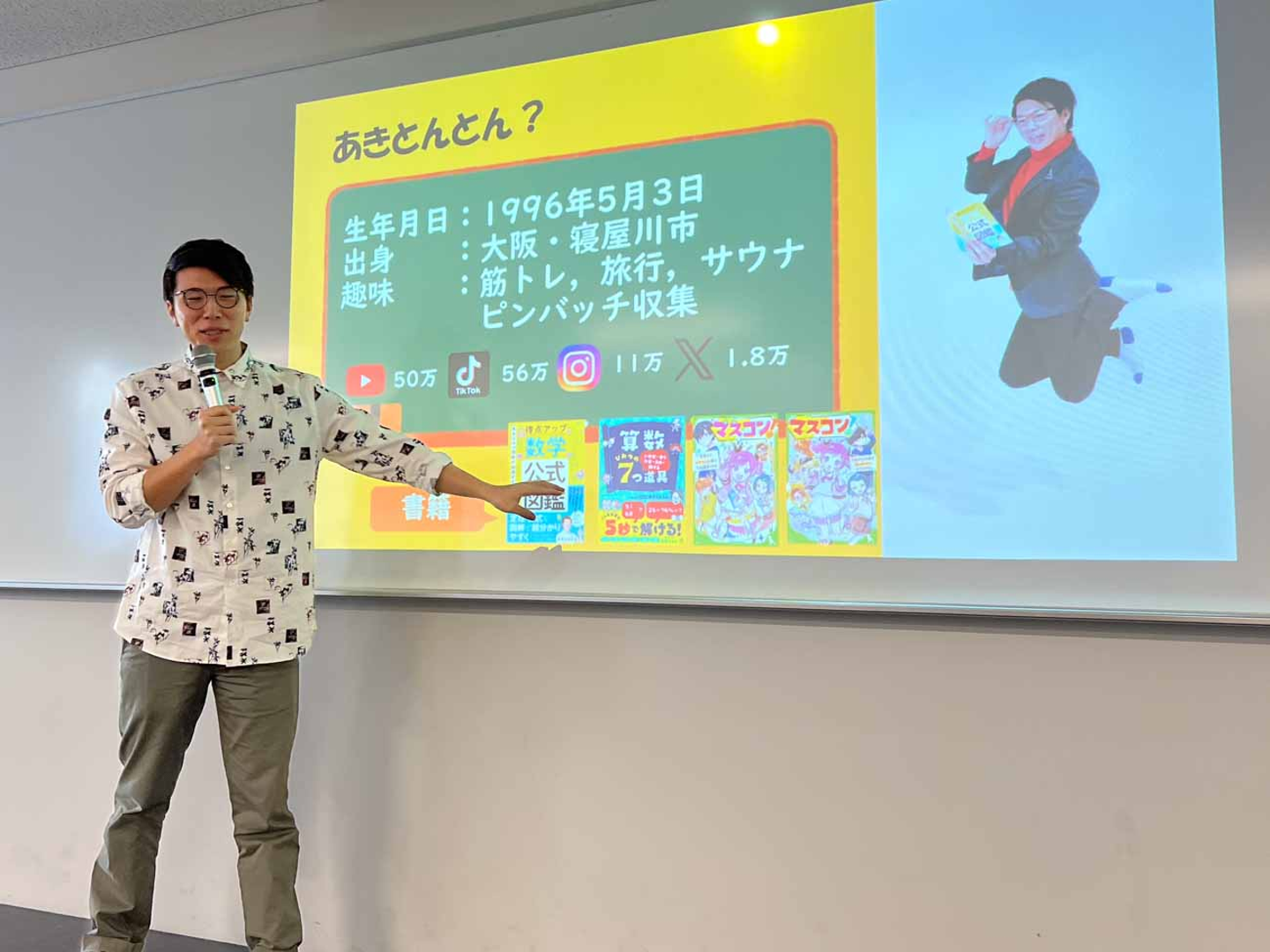 2024年10月21日、秋の風が気持ちよく吹き抜ける桜美林大学にて、人気教育系クリエイターあきとんとんが特別講義に登壇しました。