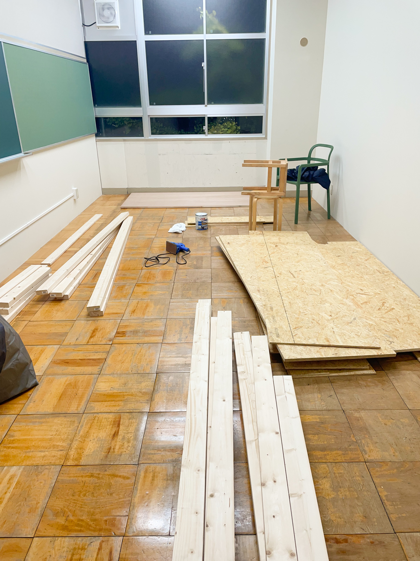 まずは、この案をつくるために施工図を作成。最初作成していたものから、実際にホームセンターで売ってた部材の大きさに変更を行い、必要な材料のカット図を書いて調達。この辺りは元設計だった私が頑張りました。ホームセンターでたこ焼き頬張りながらスピード作図です。(後日間違ってたことが判明・・・)