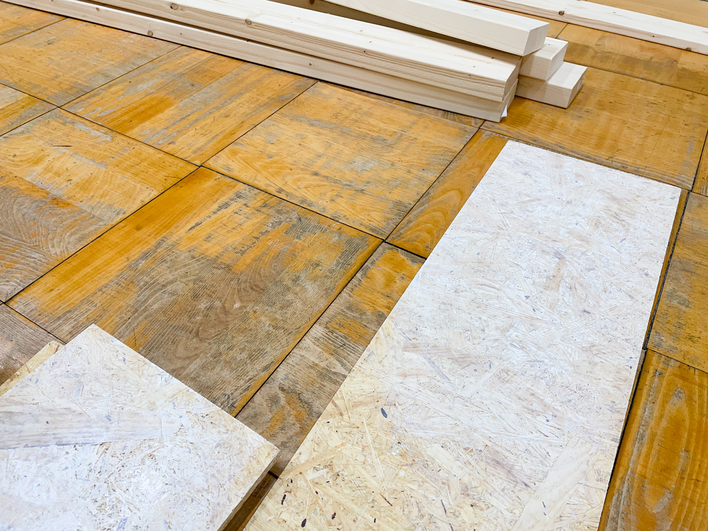 無事、搬入できました。床が小学校のままで懐かしい気分になりますよね。OSB合板に塗料が乗るかどうかも試して、いよいよ着工に入ります。