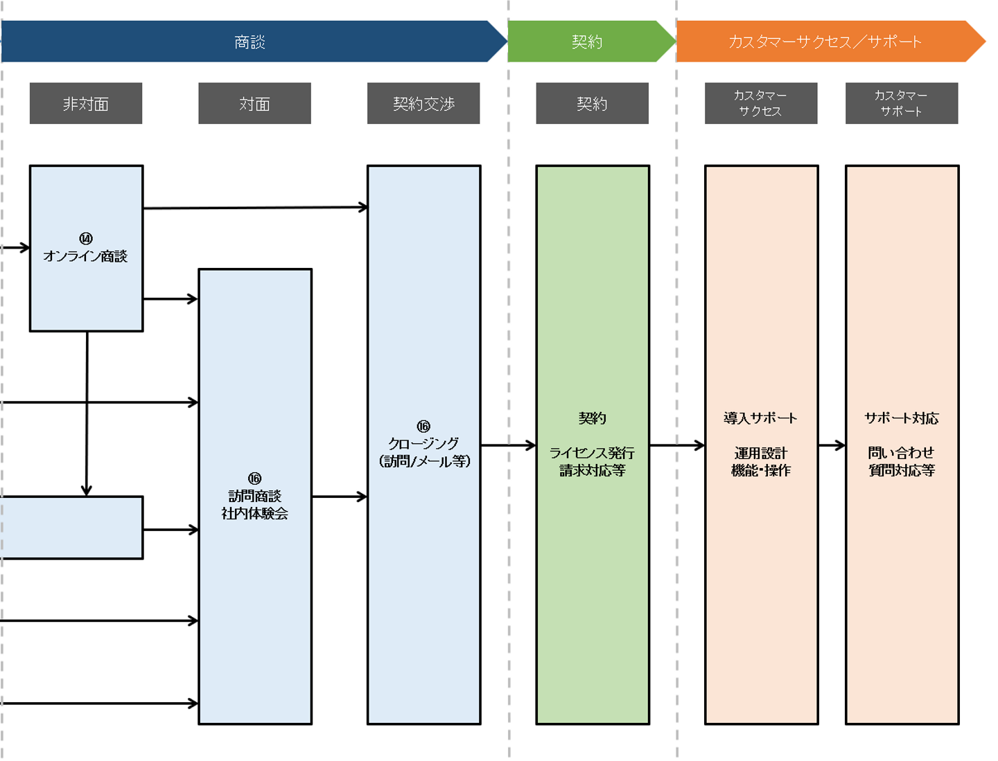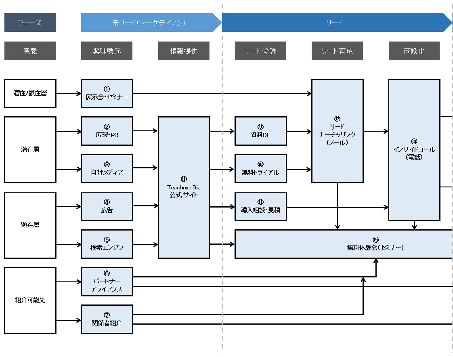 こういった施策を組み合わせて、より具体的な「商談」と呼べる状態にまで進めることが、この前半のプロセスの役割となります。