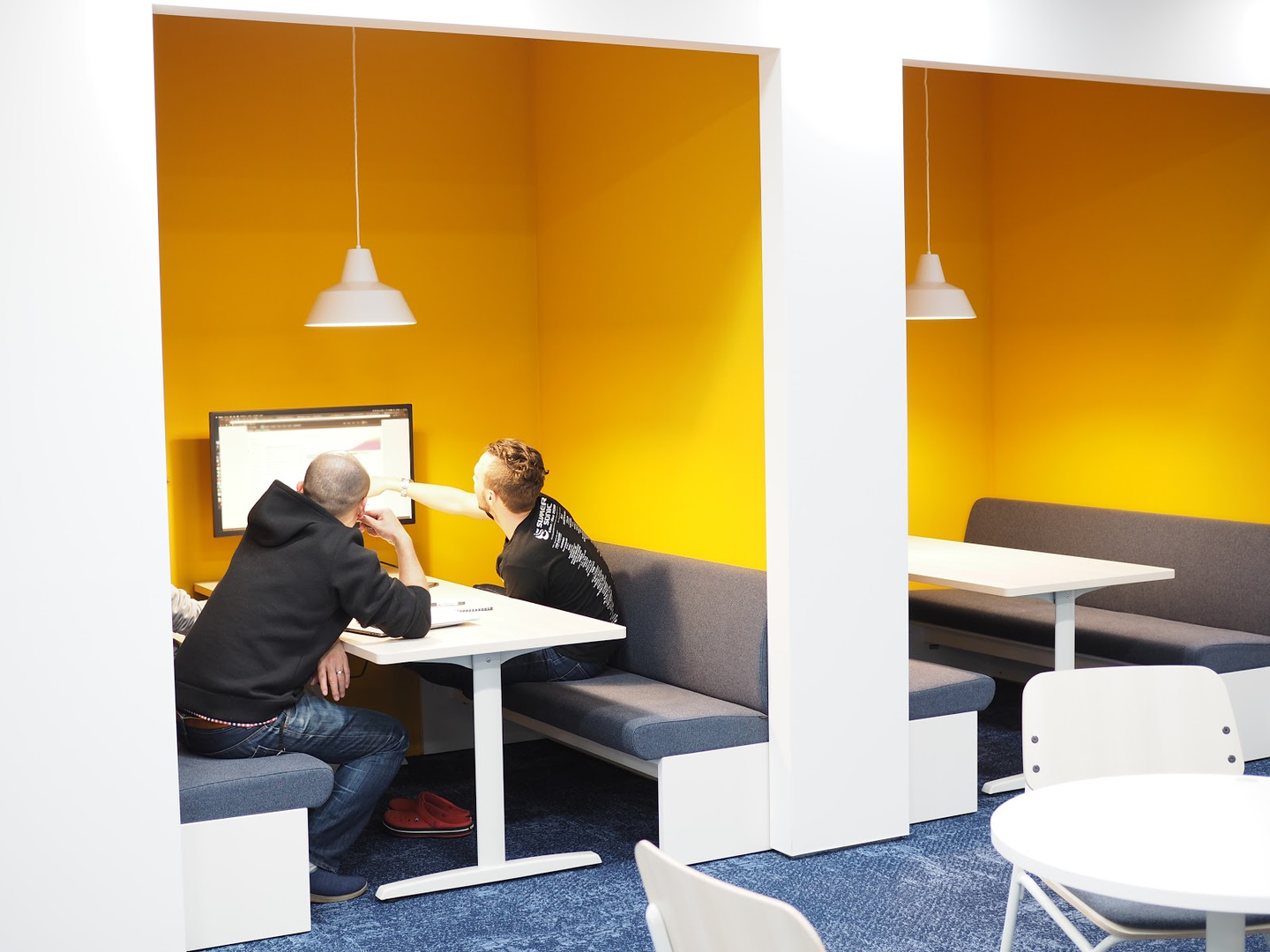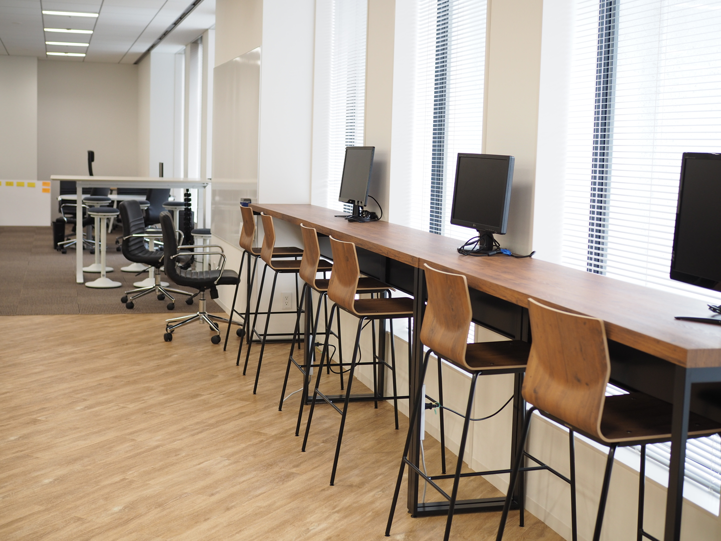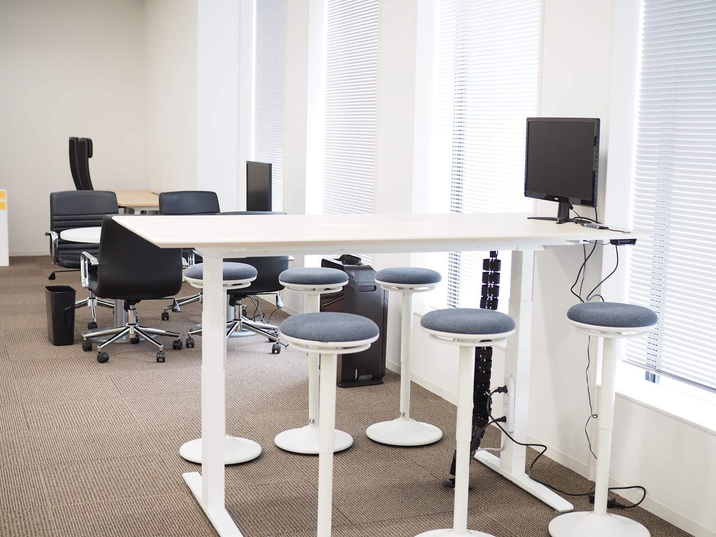 開発部エリアにもフリーのミーティングスペースがあるのですが・・・あれ?なんかちょっと机も椅子も高い・・・?