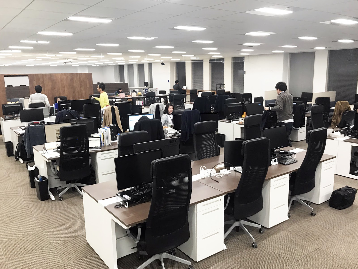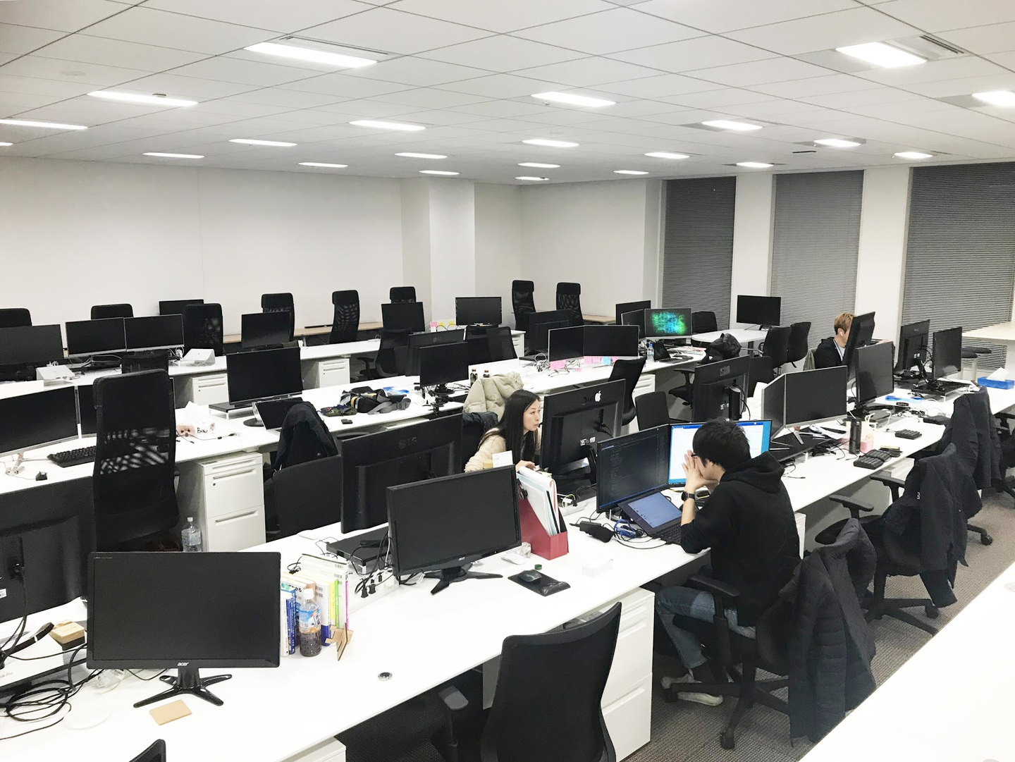 反対側は、開発部のエリア。広めのデスクで、モニターを複数設置してもゆとりがある設計になっています。20時近くに写真を撮ったら、もうほとんど人が残っていませんでした。