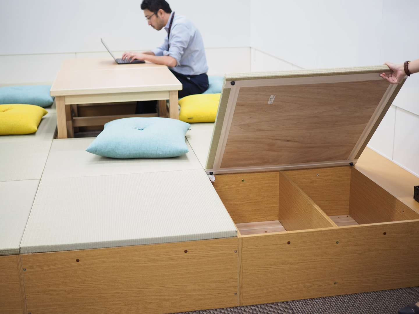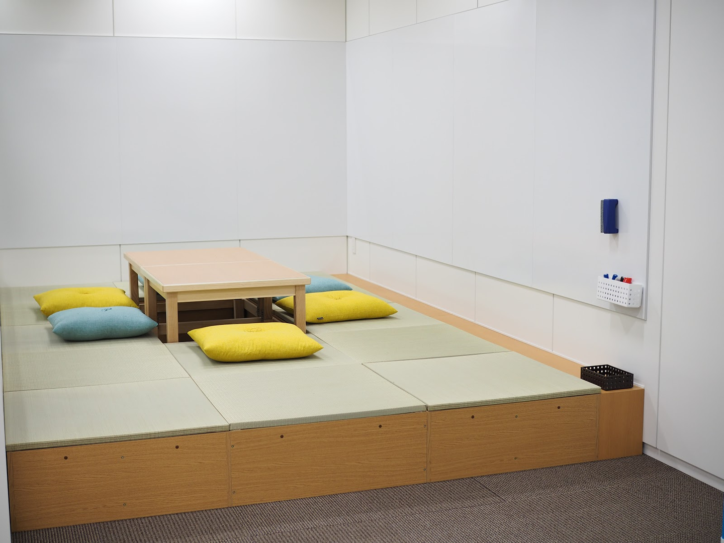 もうひとつの目玉が、メンバーからも要望が多かった畳のスペース!小上がりになっていて、快適な掘りごたつスタイル。今はまだ新しい畳の良い匂いがします。リラックススペースとして使うこともできますし、予約すればミーティングにも。