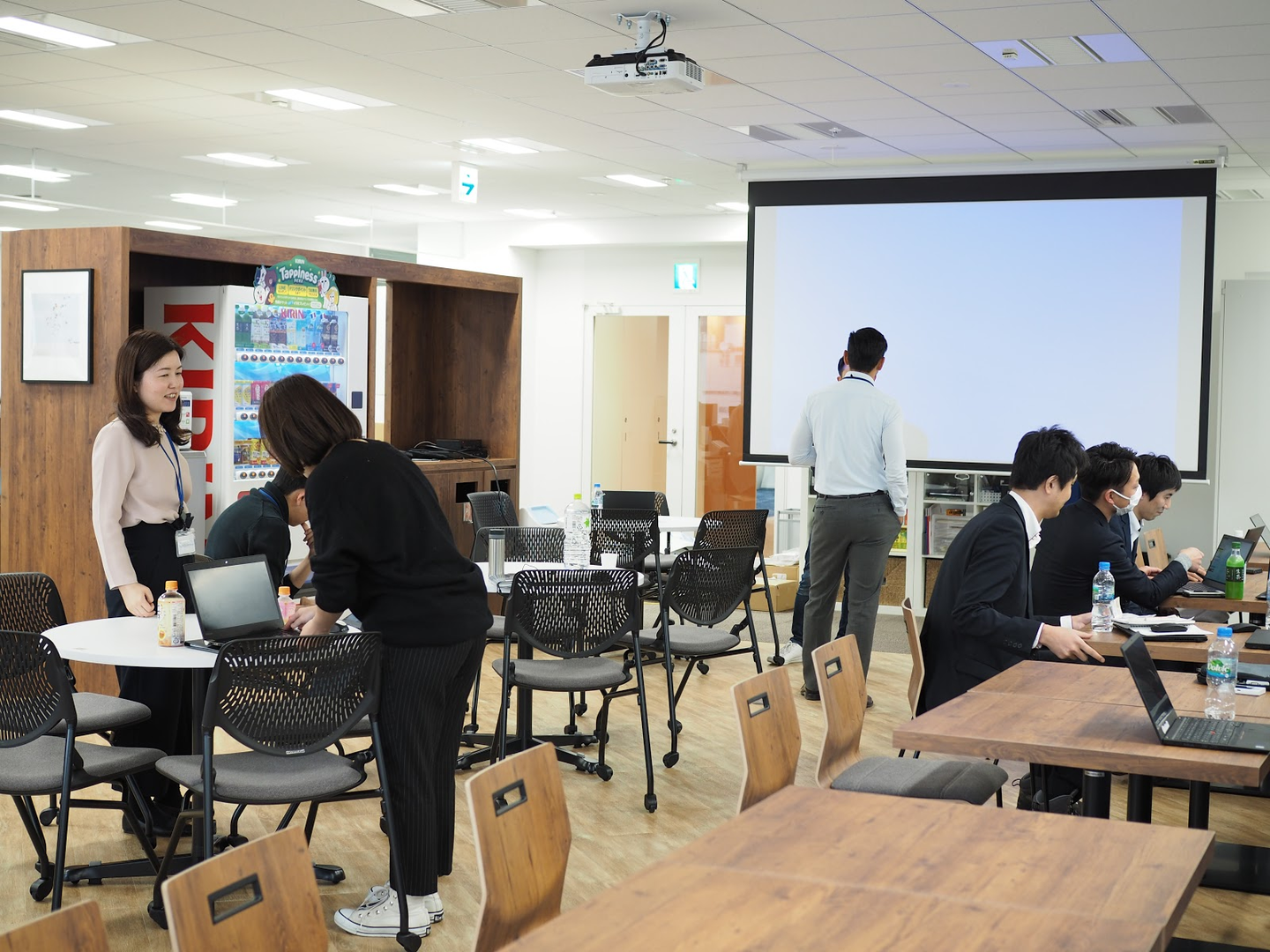 ランチを食べたり、休憩したり、ちょっとしたミーティングをしたりと、誰でも自由に使える空間で、初日から盛んに交流が行われていました。プロジェクタとスクリーン、そして音響設備を備えているので、社内勉強会や発表などもここでできるようになっています。
