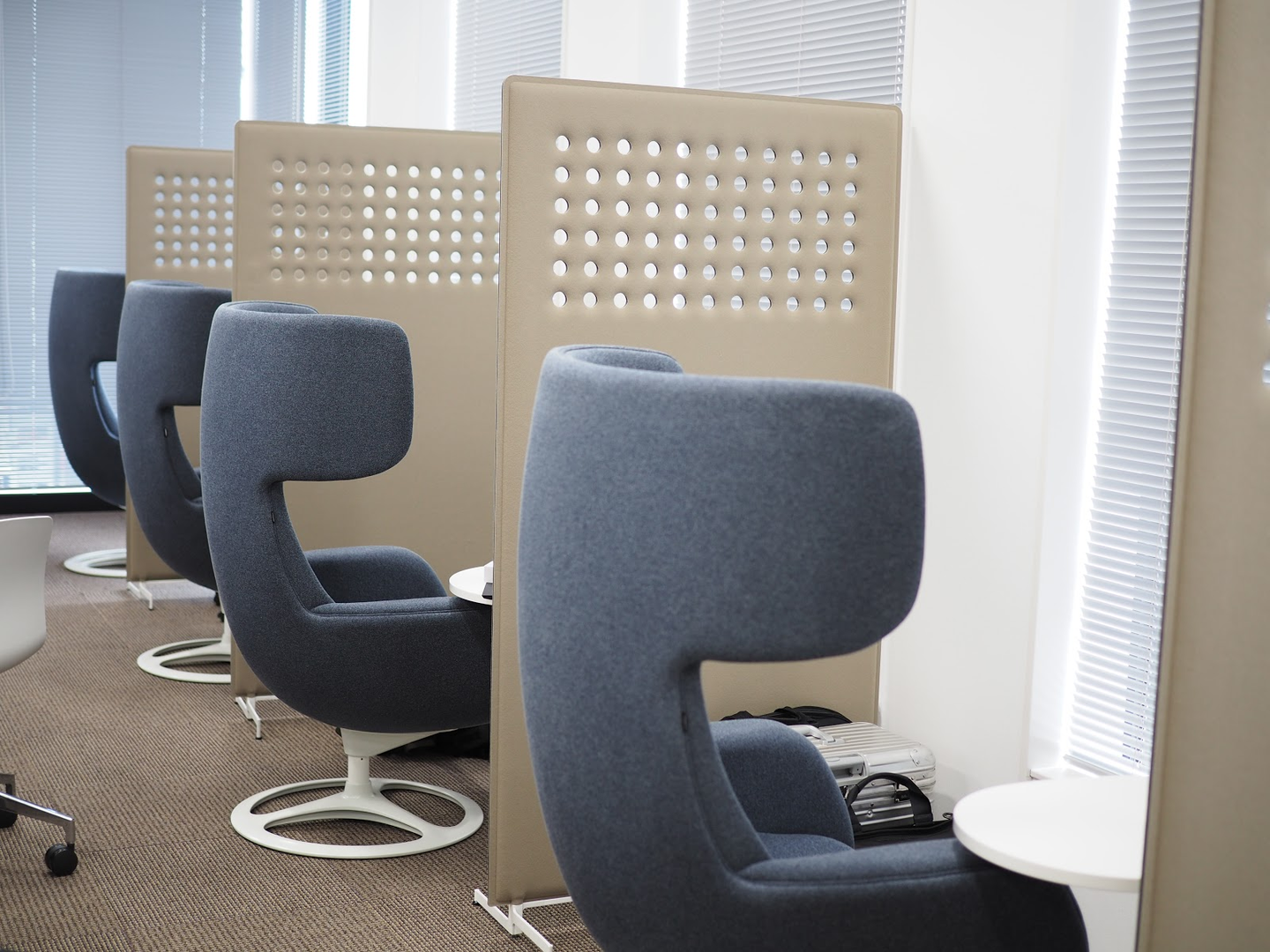 窓際に見えるのは集中スペース。一気に資料作成をしたい時にも使えますし、顔をぐるっと囲む形の椅子なので、周りを気にせず電話やオンラインミーティングもできます。座り心地もバツグン!