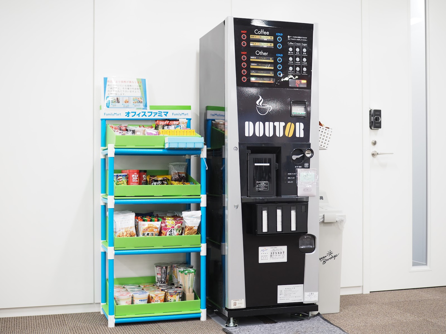 畳スペースの横には、ドトールの自販機とオフィスファミマが。淹れたてのコーヒーとお菓子で一息つけば、その後はぐんと捗りそうですね!