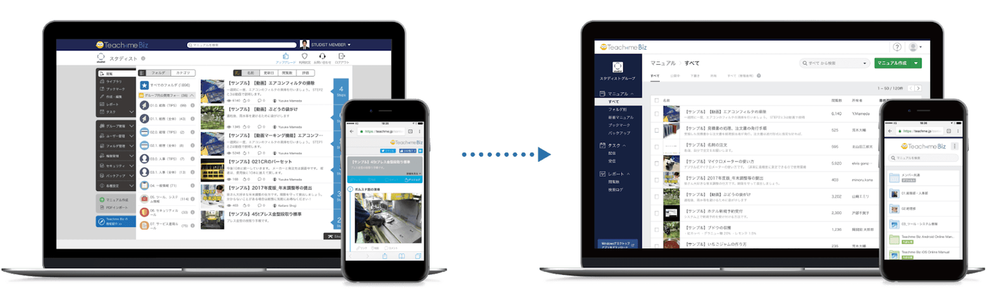 (写真:2人がデザインに関わったTeachme Biz の旧UI と新UI )