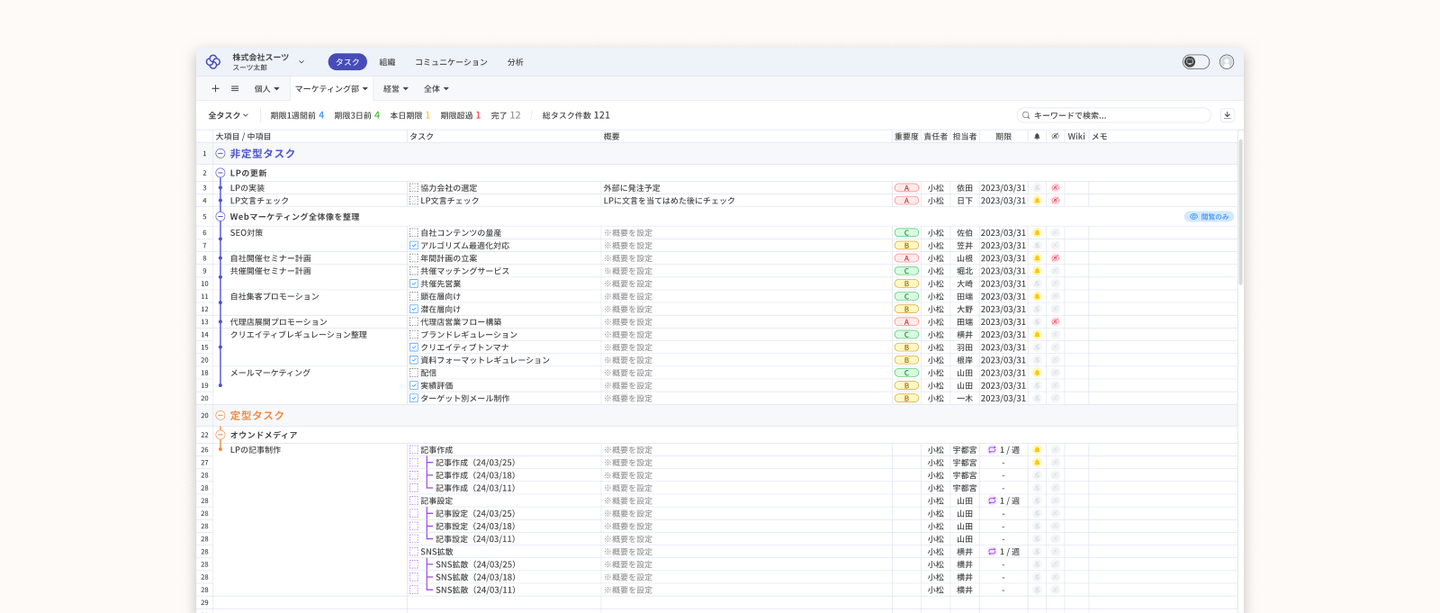 β版では、タスク・組織・コミュニケーション及び分析の基本機能に加えて、表計算ソフトにはないタスク雛型、期限通知及び定型タスクなど、チームのタスク管理をかんたんに毎日続けられる機能が搭載されました。