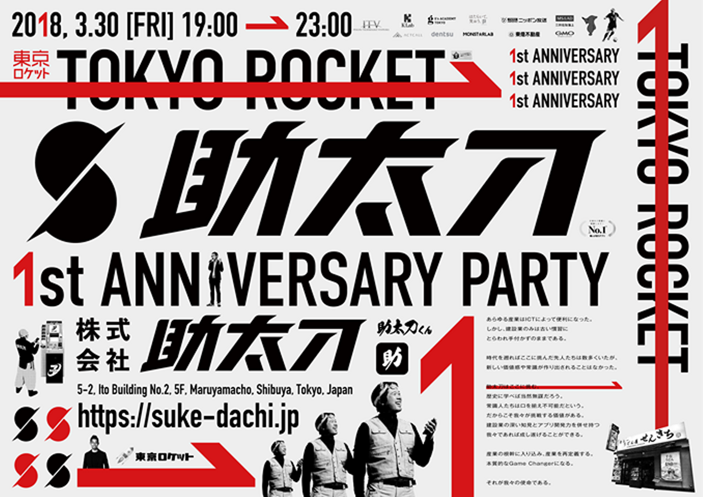 先日の3月30日、会社設立一周年を記念し、社内でパーティを開催しました。この1年間の思い出や軌跡を凝縮した巨大なポスターをCPOの小川が作り上げました!デザインのコンセプトは「1と→」です。一周年をお祝いしつつ「東京ロケット」→「助太刀」、「道玄坂オフィス」→「次の移転先(引っ越し記念パーティやります!)」など、激動の一年間を一枚のポスターで表現しています。支援していただいた皆様はもちろんのこと、ロゴやアプリのデザインの変遷も随所に散らばっております。細かく見るとわかる人にはわかる助太刀の歴史が詰まっております!