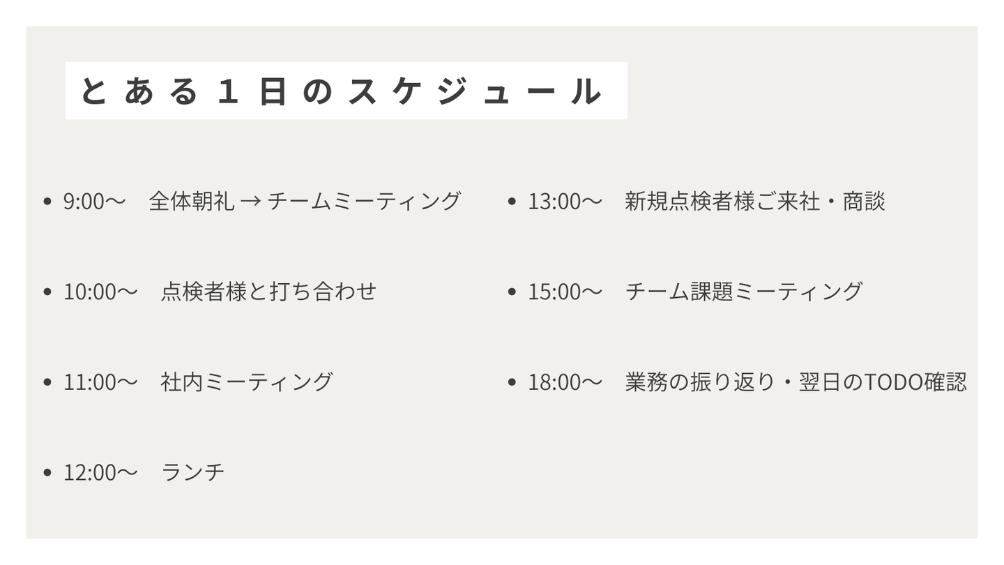 全国に点検者様がいると地域ごとで「感じ方」や「反応」の違いがどうしても生まれてしまうので、業界の情報共有を積極的に行い、地場の話題も交えたりして、とにかくコミュニケーションを多くとることを大切にしています。