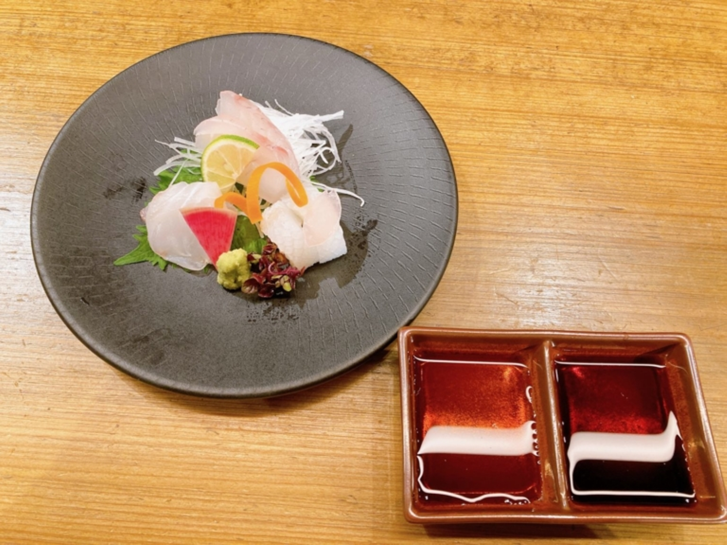 ▲こだわりの鮮魚のお造り🍵お好みの醤油でいただきます